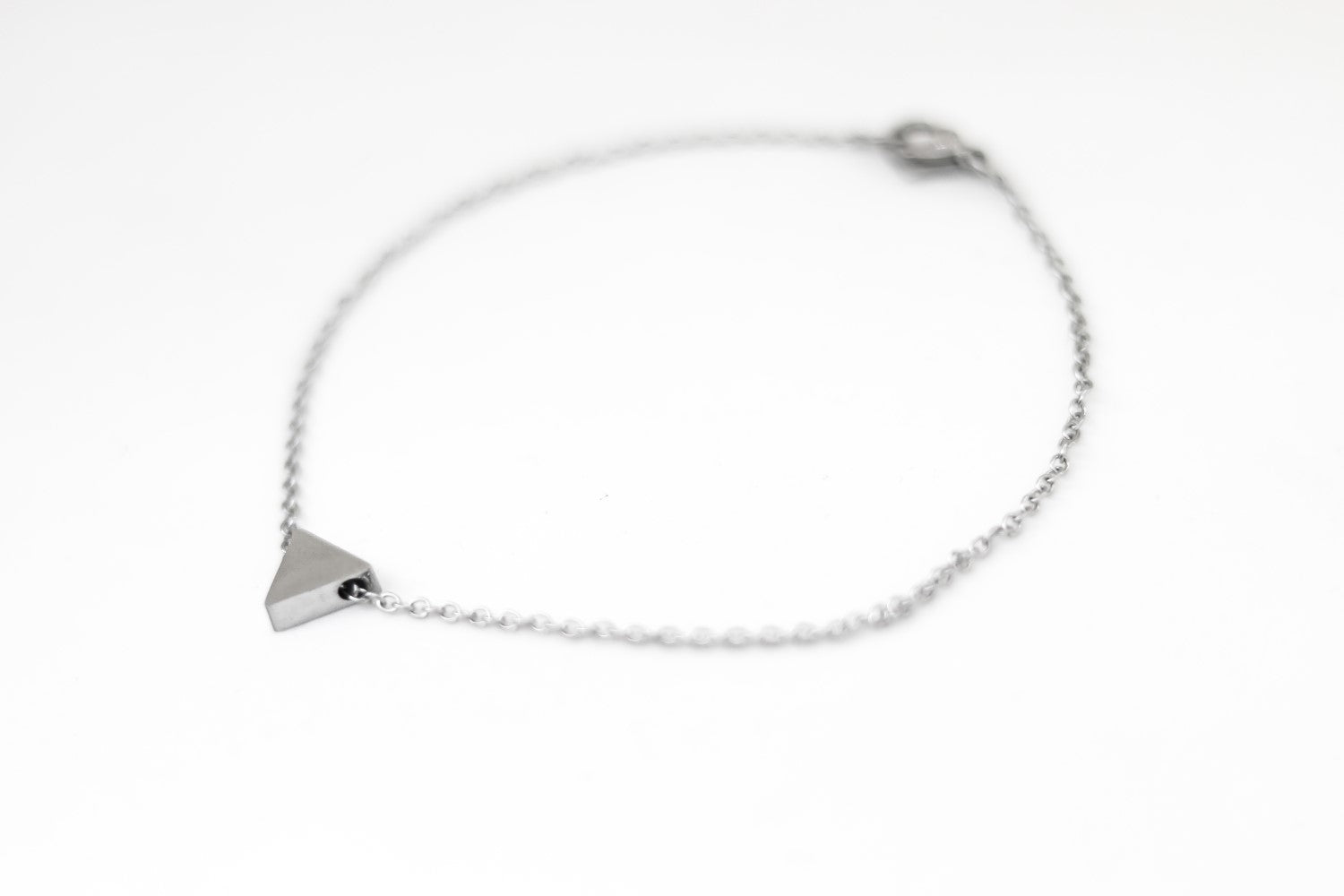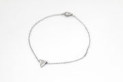 Triangle bracelet with a small triangle bead charm on a silver tone stainless steel waterproof chain. Clasp closure.