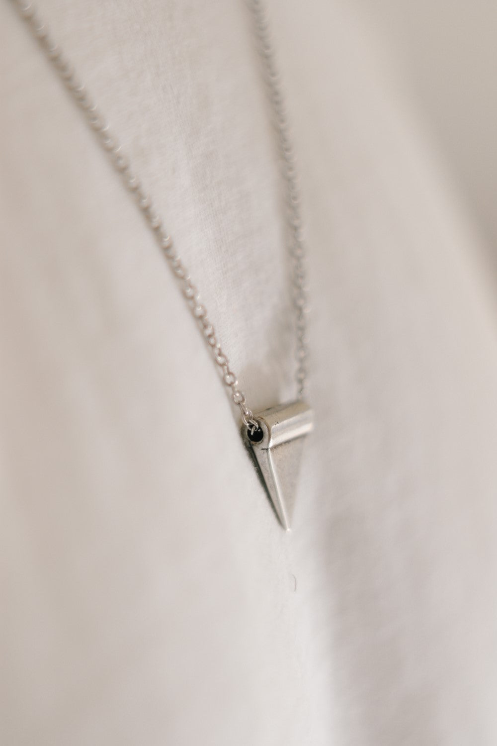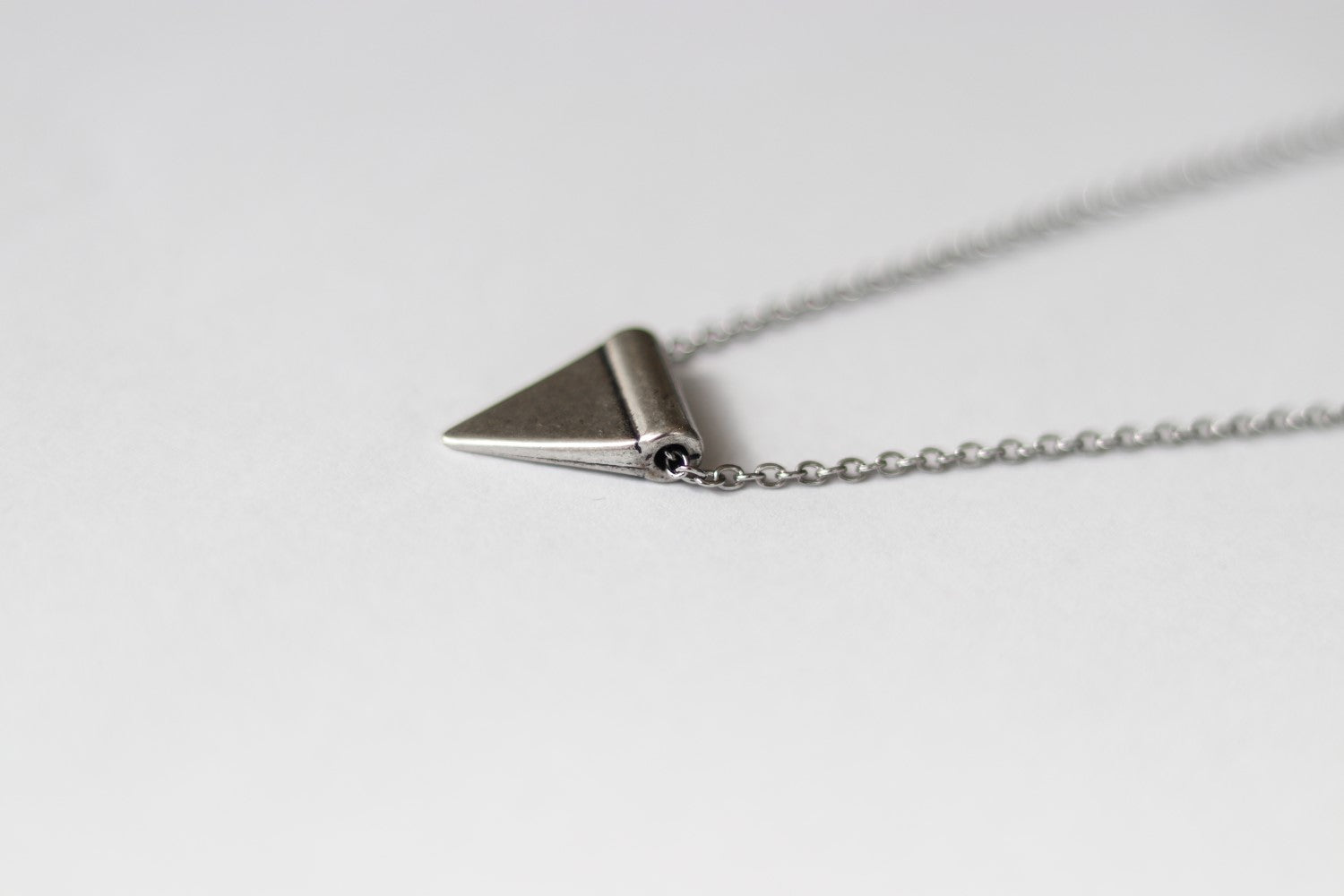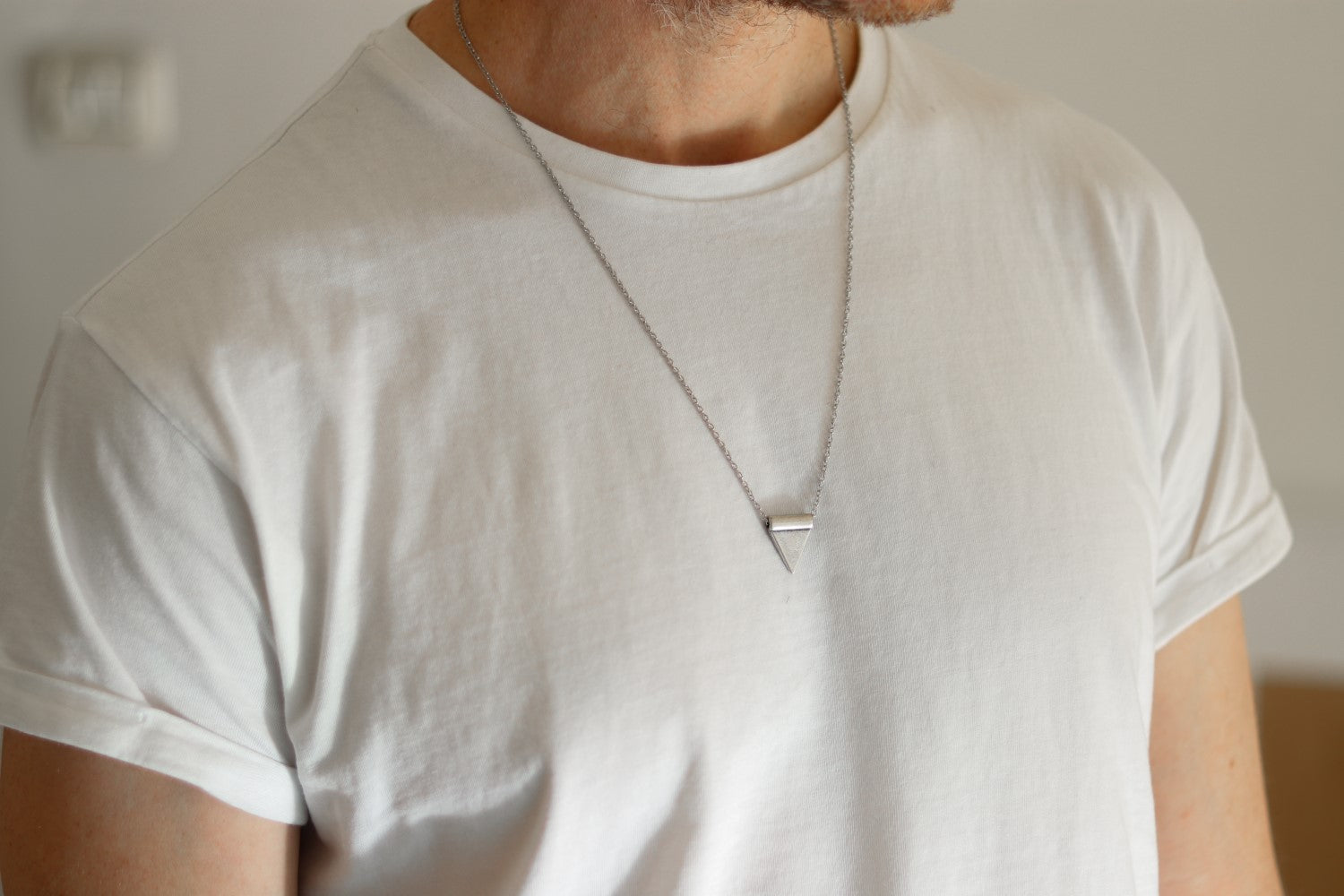 Pendant necklace for men - men's necklace with a silver plated triangle pendant on a stainless steel chain and a clasp closure.