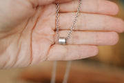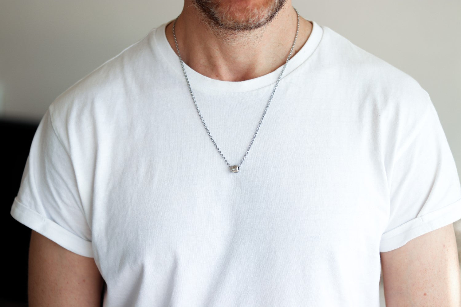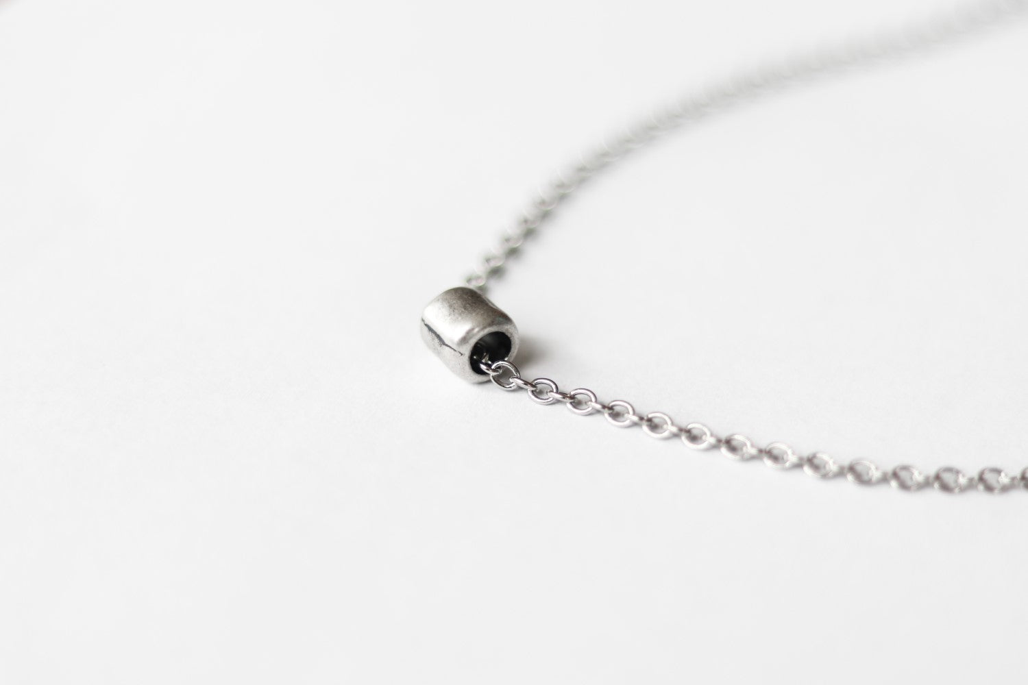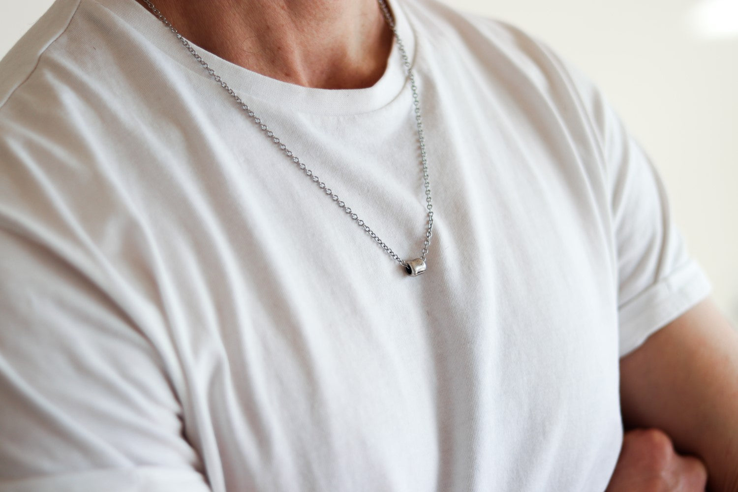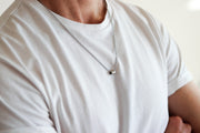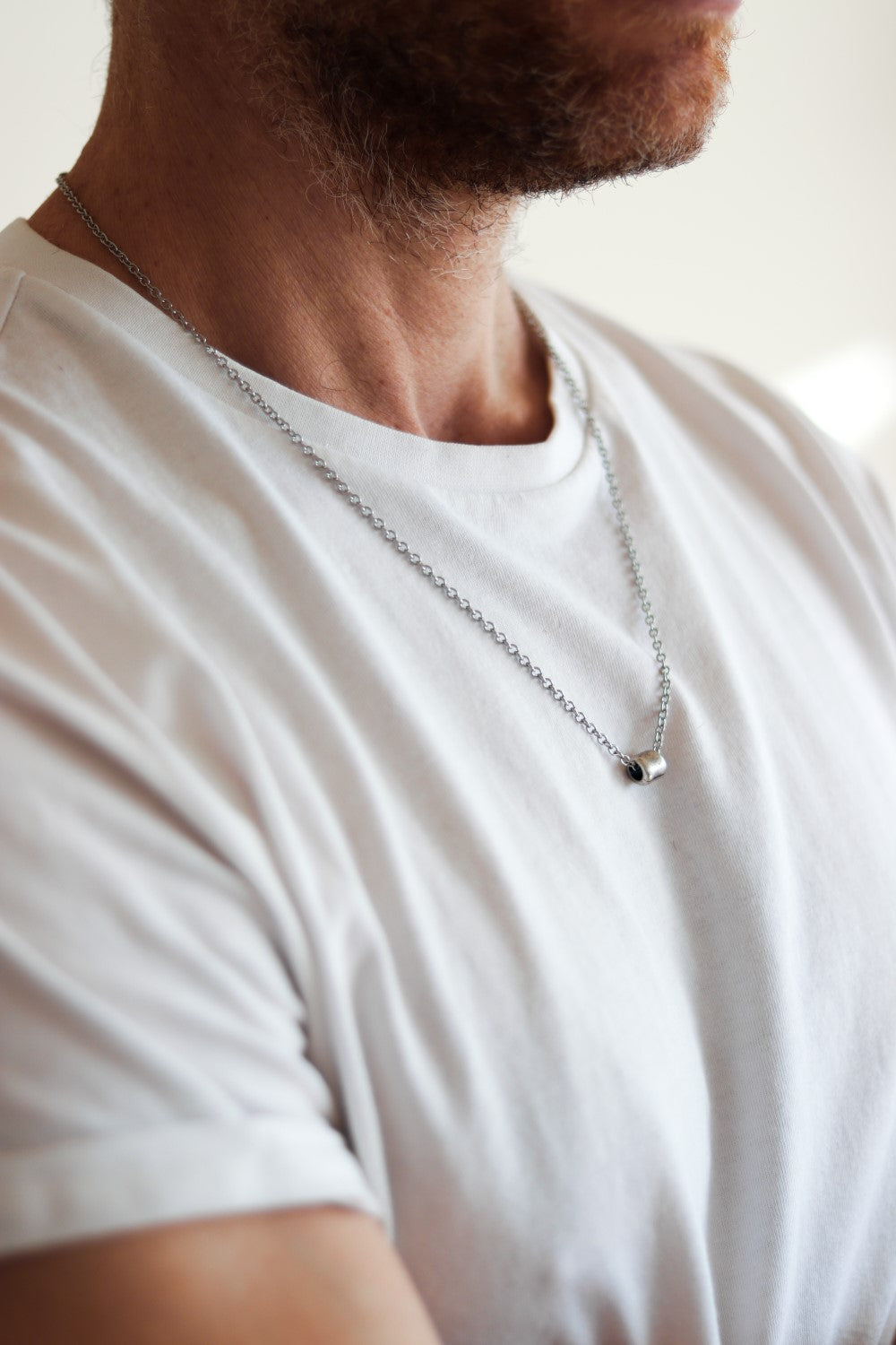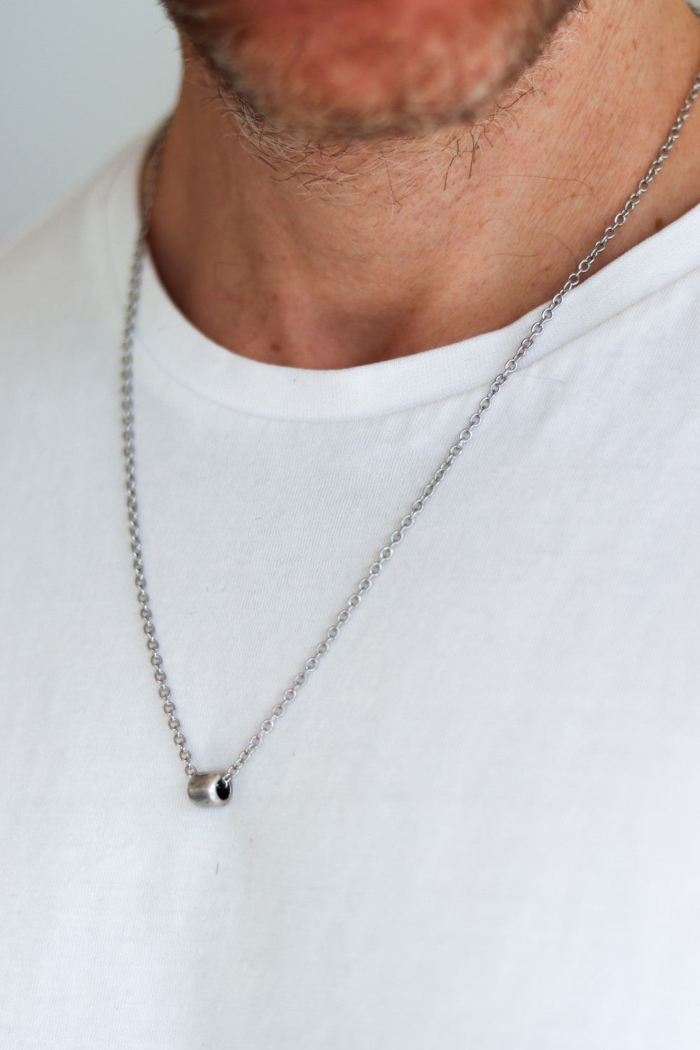 Necklace for men - chain necklace with a silver plated tube bead pendant. The chain is made of stainless steel and the bead is silver plated. Clasp closure.