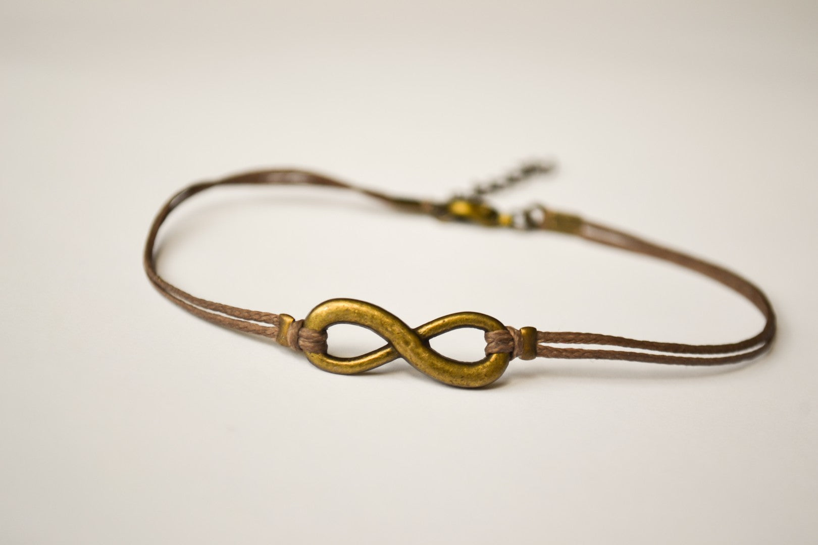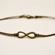 Infinity anklet - cord anklet with a bronze tone infinity charm. The color of the cord is made of cotton. The charm is made of alloy. The anklet comes with an extension so it is adjustable. Clasp closure. You can choose a thread in a different color from the colors shown in the last picture.