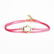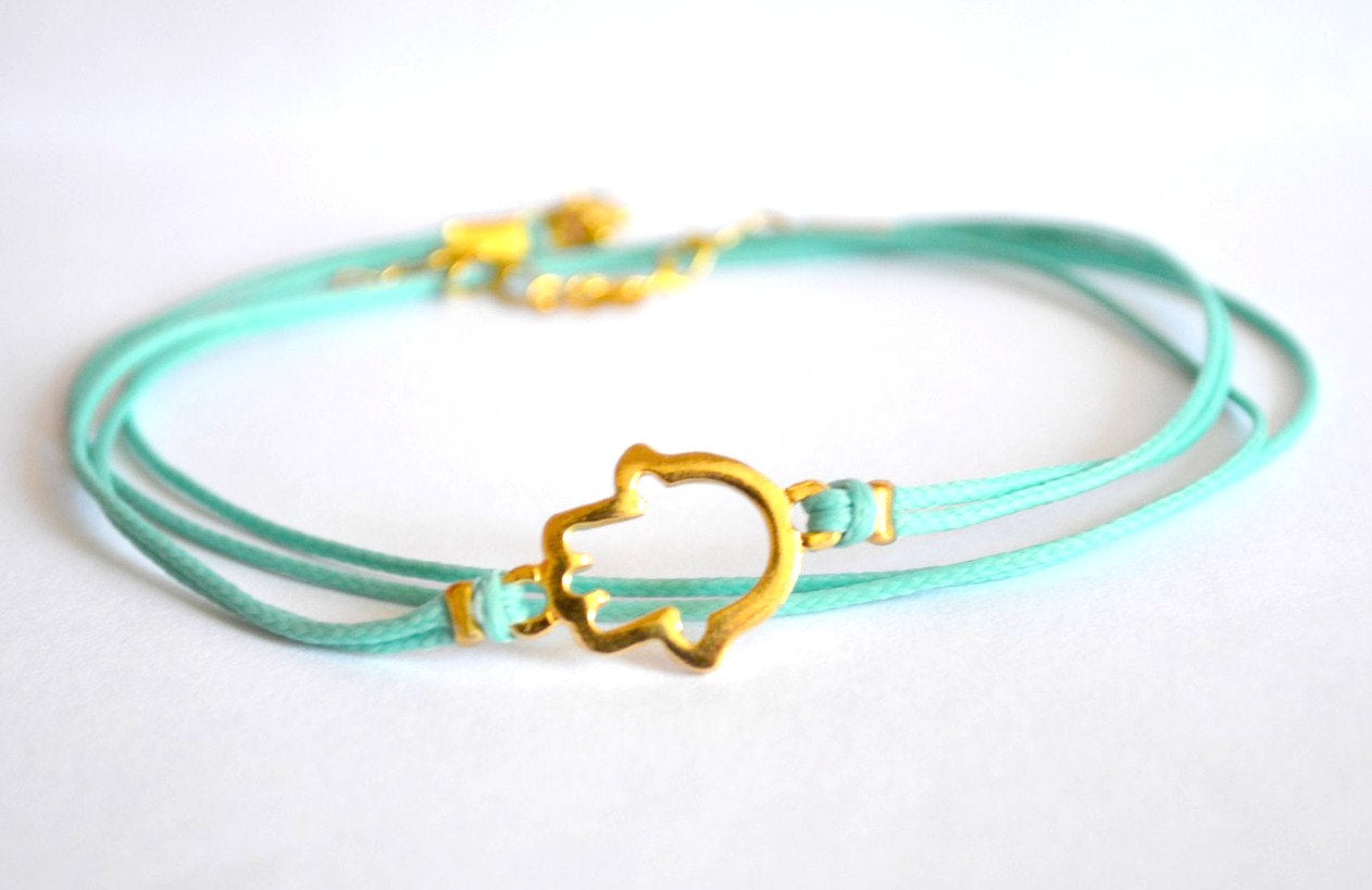 Wrapped Hamsa bracelet - cord bracelet with a gold plated Hamsa charm. The cord is dark green and made of cotton. The bracelet comes with an extension so it is adjustable. Clasp closure. You can choose a thread in a different color shown in the last picture.