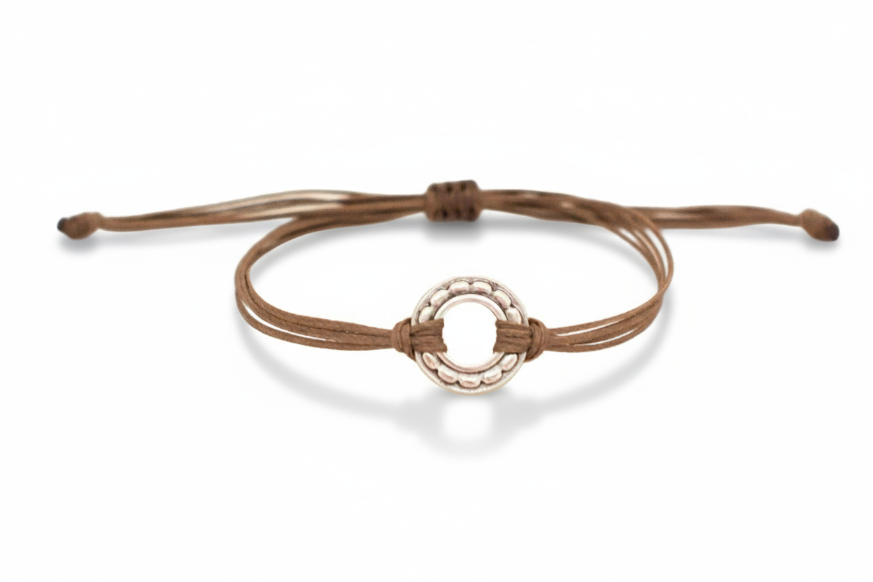 Armband für Herren – Kordelarmband mit einem silberfarbenen runden Anhänger. Die Kordeln sind hellbraun und aus Baumwolle gefertigt, der Anhänger besteht aus einer Legierung. Sie können eine andere Kordelfarbe aus den auf dem letzten Bild gezeigten Farben auswählen. Verschluss: verstellbarer Schiebeknoten.