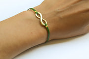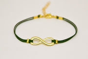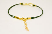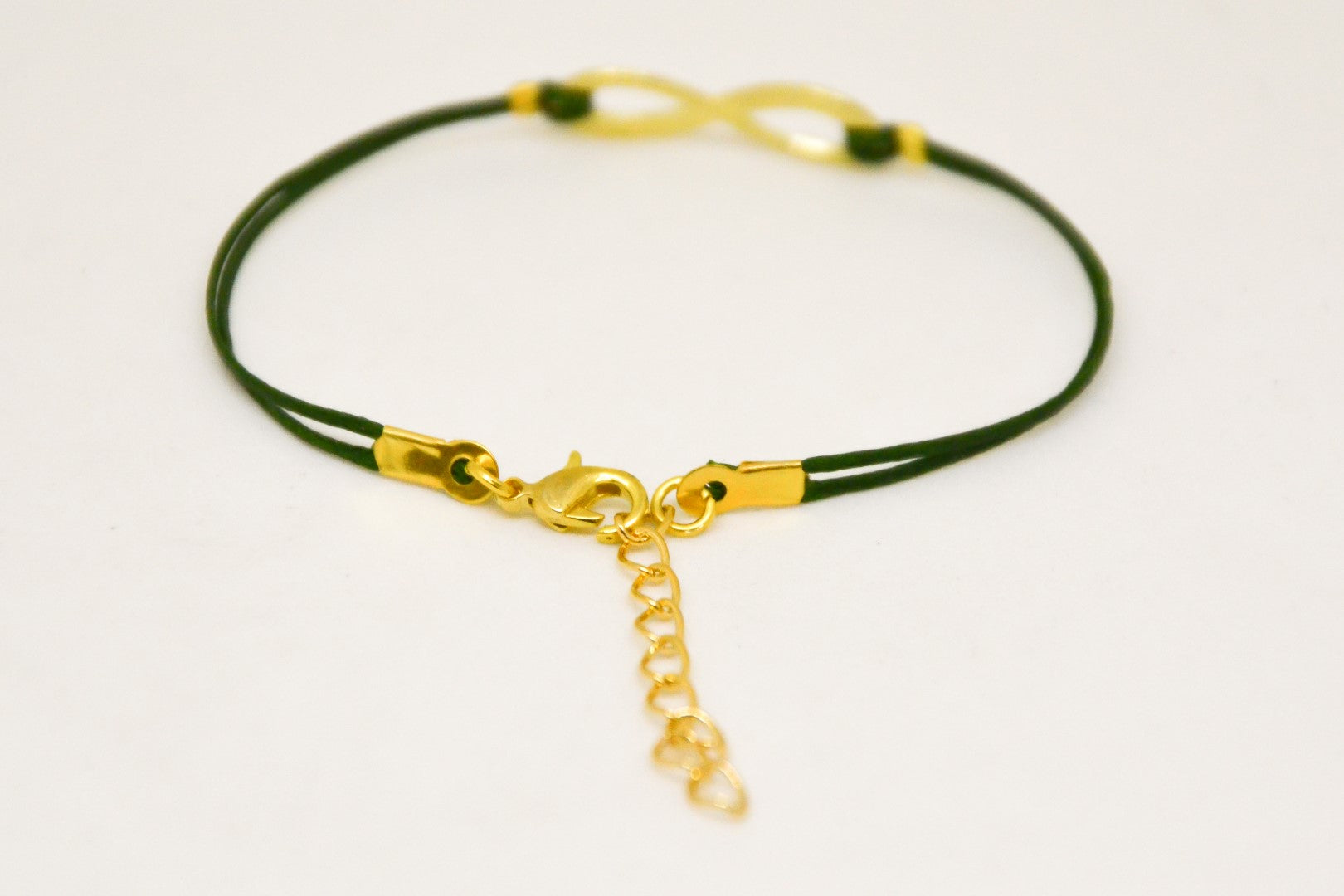 Infinity-Armband – Kordelarmband mit einem goldfarbenen Infinity-Charm. Die Kordel ist hellblau und besteht aus gewachster Baumwolle und der Anhänger besteht aus einer Legierung. Das Armband wird mit einer Verlängerung geliefert, sodass es verstellbar ist. Hakenverschluss. Sie können eine andere Kordelfarbe als die im letzten Bild gezeigten Farben anfordern.