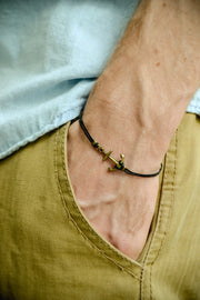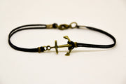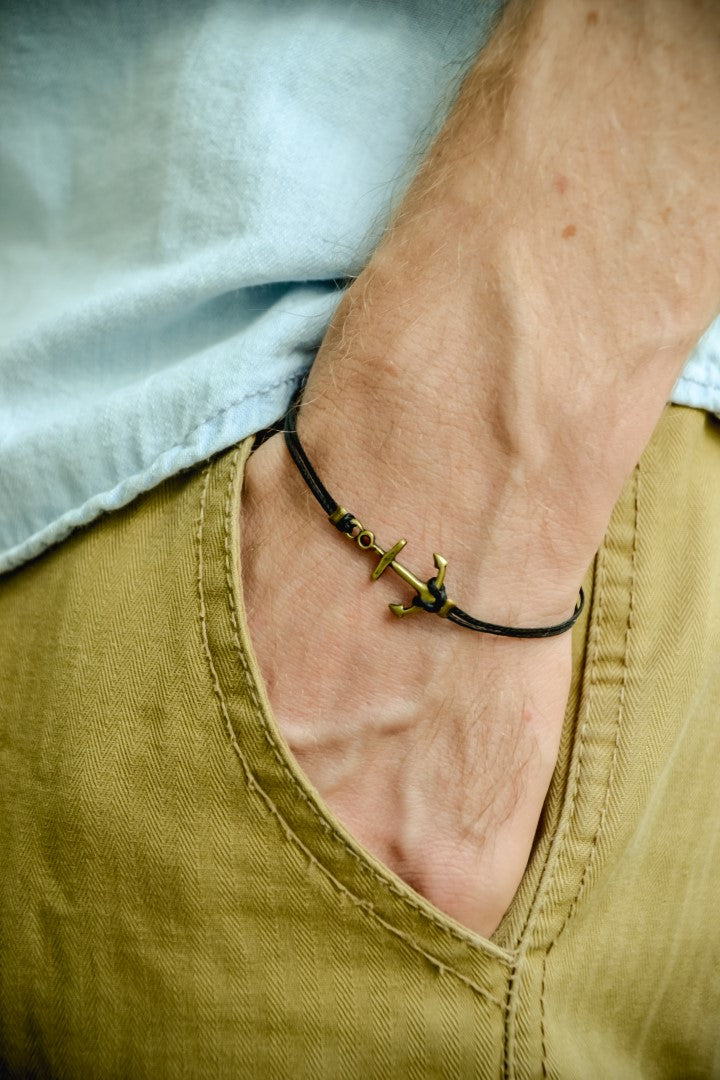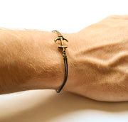 Ankerarmband für Herren – Kordelarmband mit bronzefarbenem Ankeranhänger. Die Kordel ist dunkelblau und besteht aus gewachster Baumwolle und der Anhänger ist aus Messing.