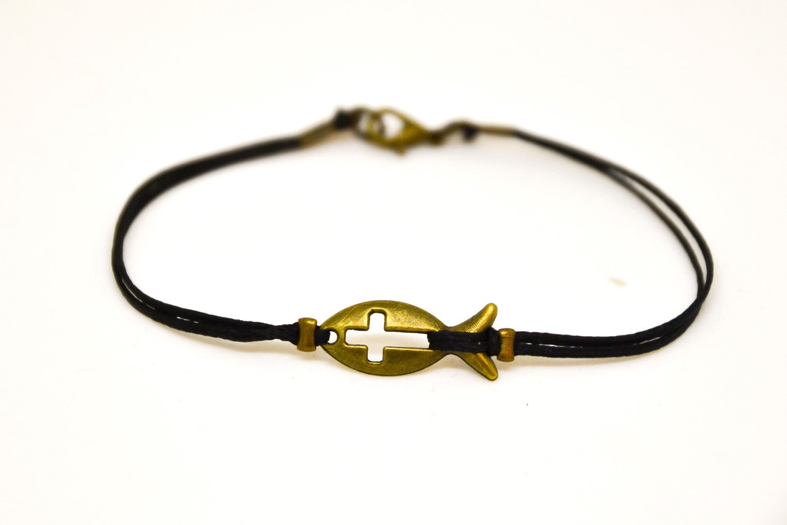 Bronzefarbenes Kreuz-Fisch-Armband für Männer, beige Kordel, christliches Geschenk für ihn