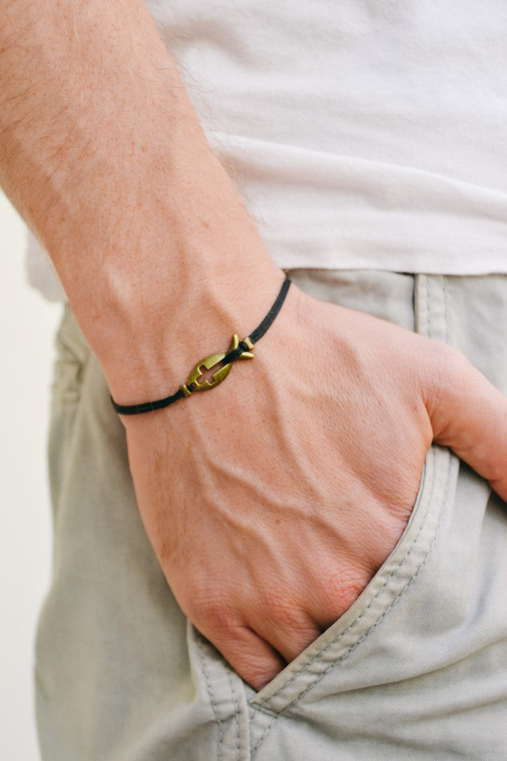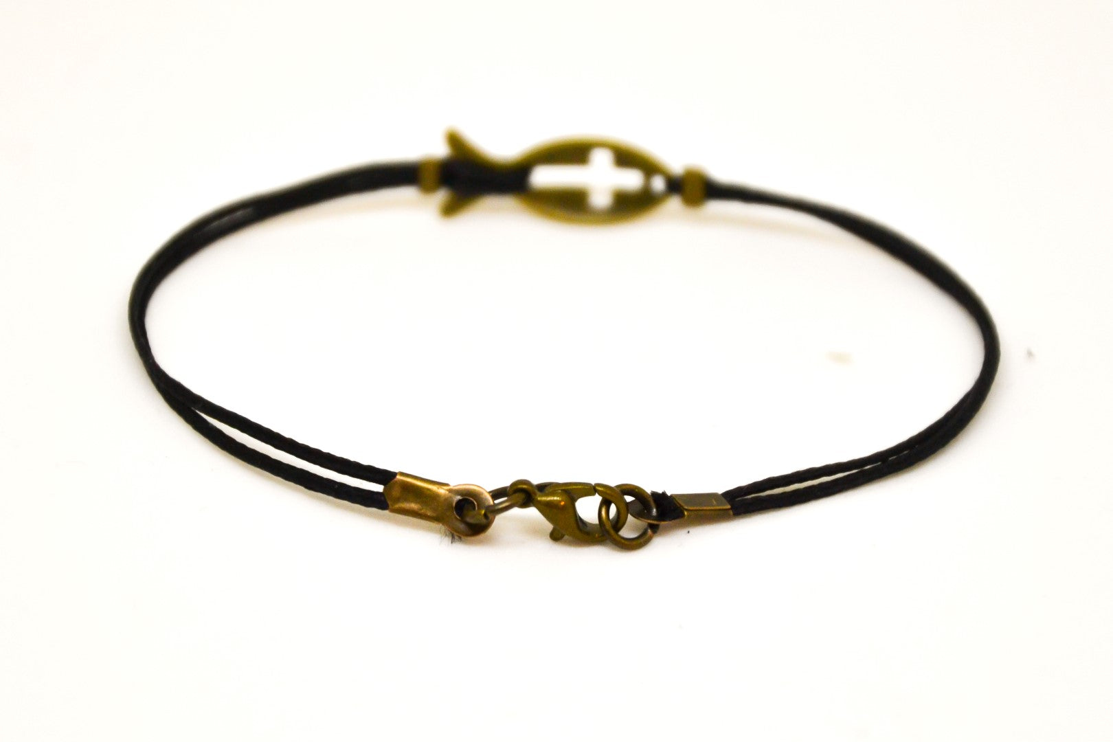 Kreuz-Fisch-Armband für Männer – Kordelarmband mit einem bronzefarbenen, fischförmigen Kreuzanhänger. Die Kordeln sind beige und bestehen aus gewachster Baumwolle und der Anhänger besteht aus einer Legierung. Verschluss: Verschluss. Sie können eine andere Kordelfarbe als die im letzten Bild gezeigten Farben anfordern.