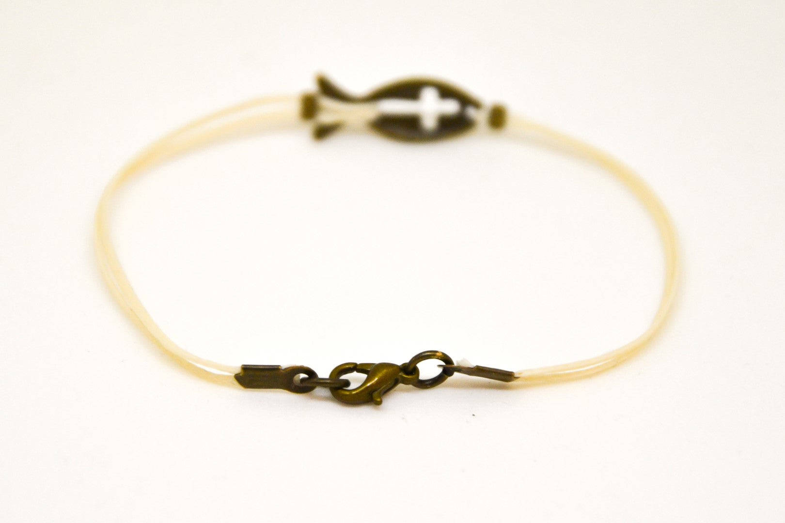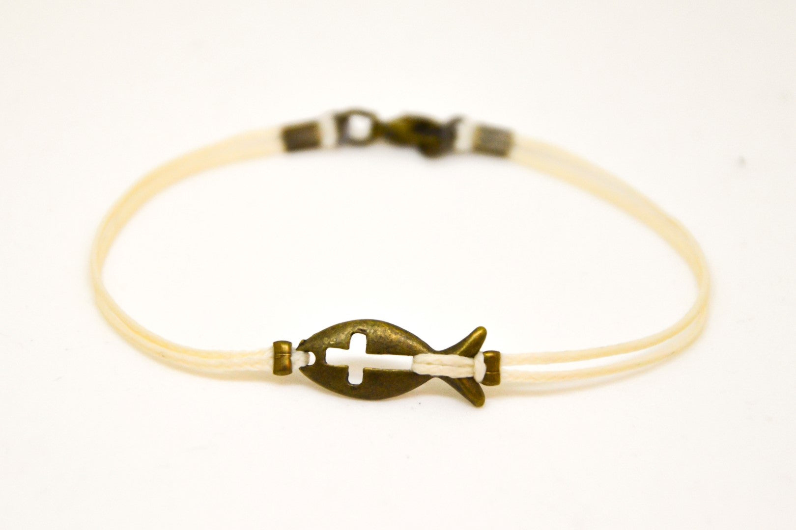 Kreuz-Fisch-Armband für Jungen – Kordelarmband mit einem antik bronzefarbenen Fisch-Kreuzanhänger. Die Kordeln sind schwarz und bestehen aus gewachster Baumwolle und der Anhänger besteht aus einer Legierung. Verschluss: Verschluss. Sie können eine andere Kordelfarbe als die im letzten Bild gezeigten Farben anfordern.