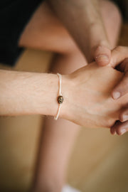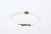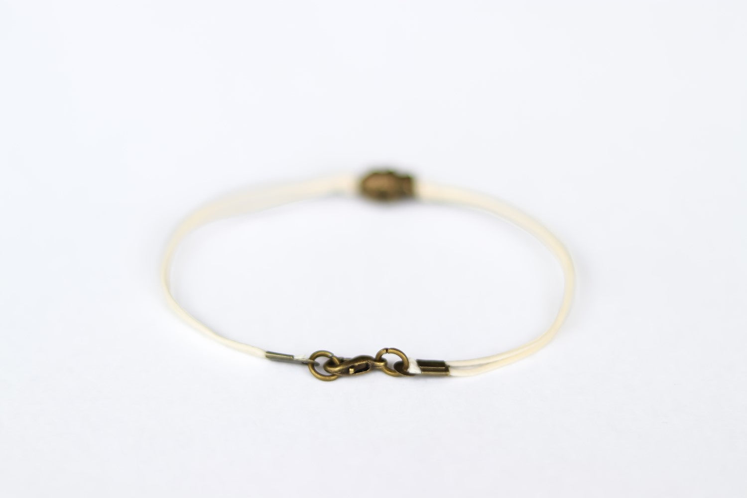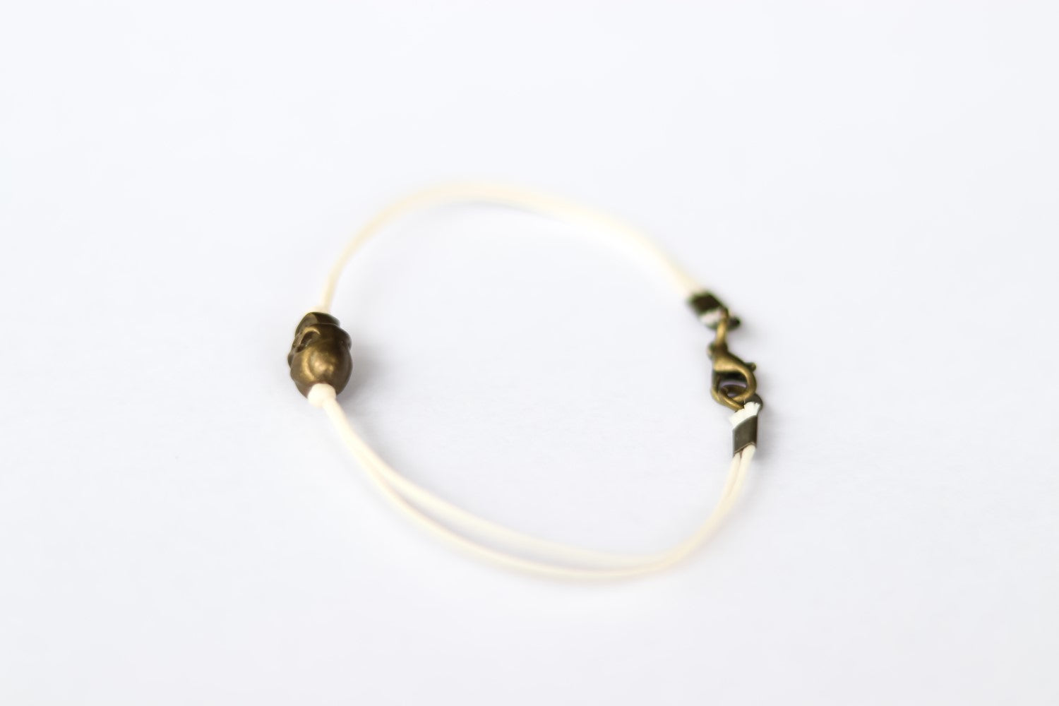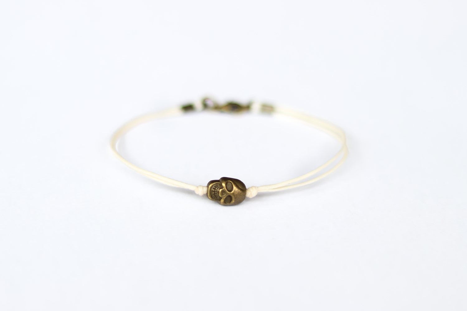 Totenkopf-Armband für Herren – Kordelarmband mit einem bronzefarbenen Totenkopf Perlenanhänger. Die Kordel ist beige und besteht aus gewachster Baumwolle und der Anhänger besteht aus einer Legierung. Hakenverschluss. Sie können eine andere Kordelfarbe als die im letzten Bild gezeigten Farben anfordern.