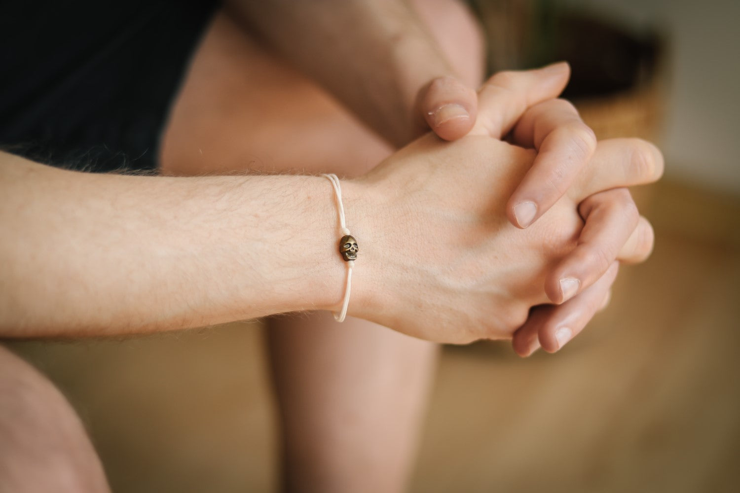 Bronzenes Totenkopf-Perlenarmband für Männer, beige Kordel, Geschenk für ihn