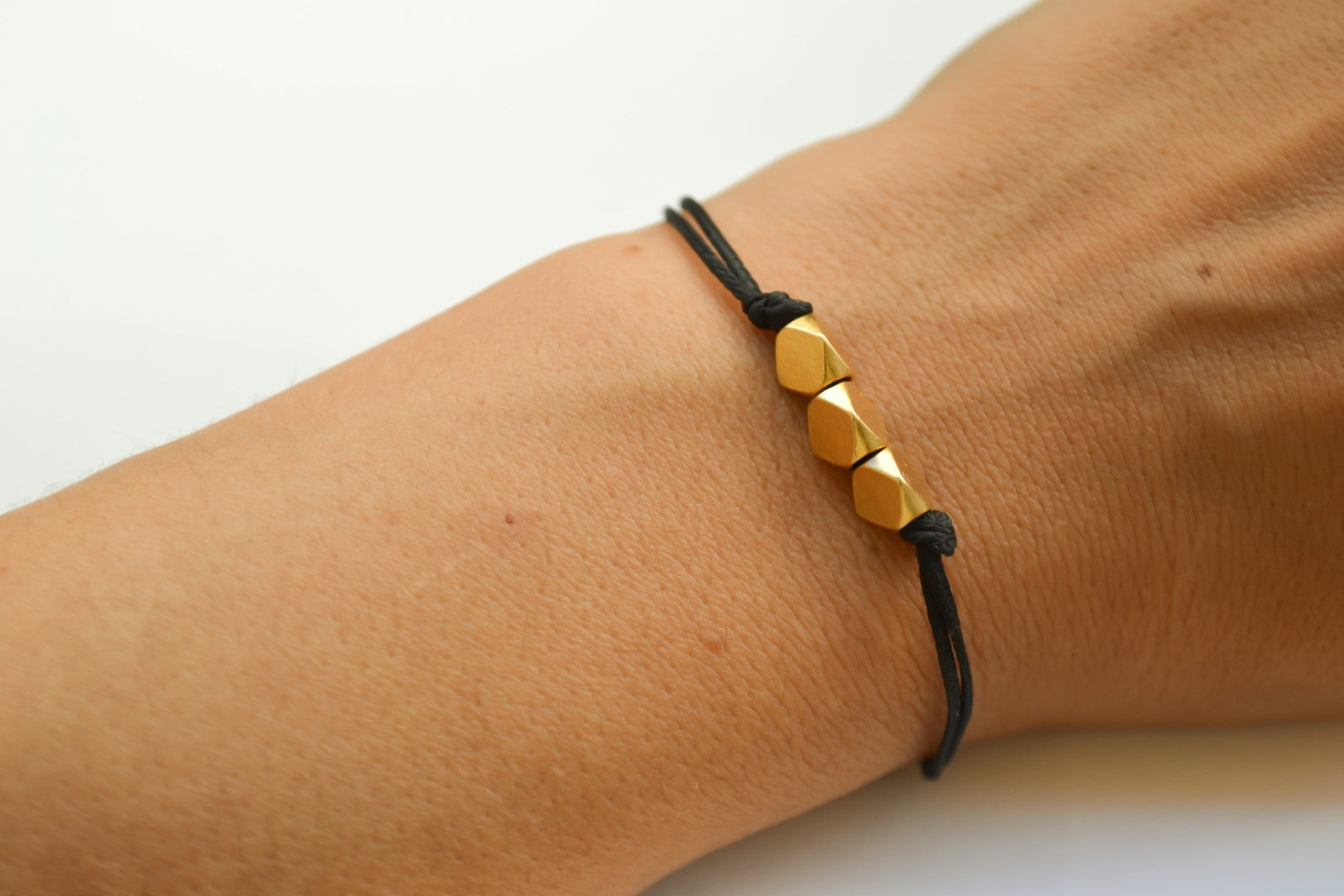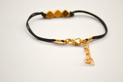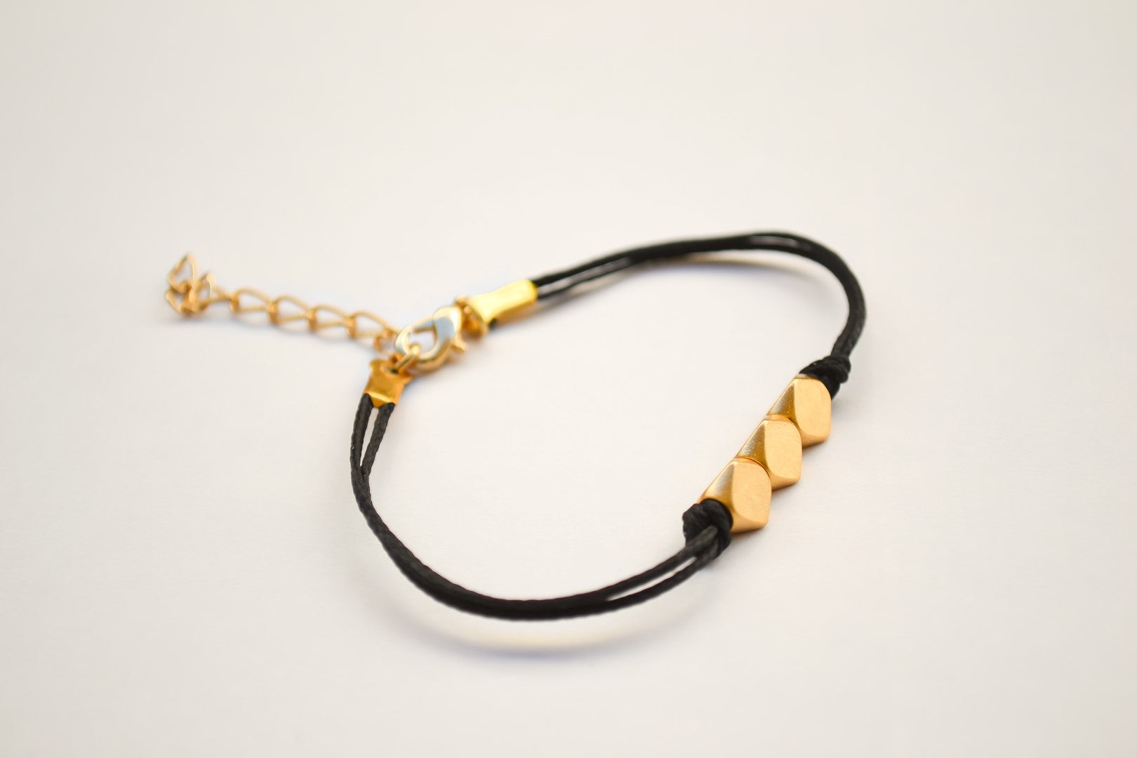 Armband mit vergoldeten Nuggets – Kordelarmband mit drei vergoldeten Nugget-Perlen. Die Kordel ist hellbraun und aus Baumwolle gefertigt, der Anhänger ist 14 Karat vergoldet. Das Armband wird mit einer Verlängerung geliefert, sodass es verstellbar ist. Verschluss mit Karabinerhaken. Sie können eine andere Kordelfarbe aus den auf dem letzten Bild gezeigten Farben wählen. ***Dieses Angebot gilt für ein Armband***