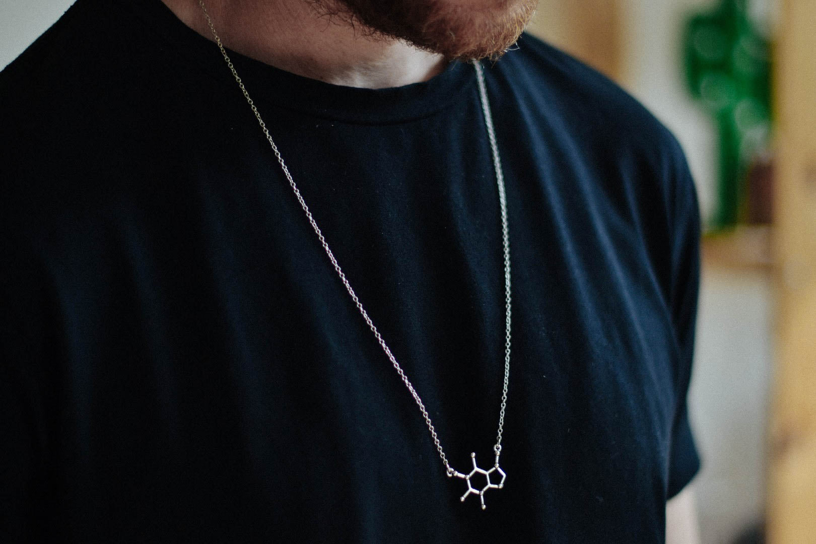 Koffein- Halskette für Männer – Herrenhalskette mit einem silberfarbenen Koffeinmolekül-Anhänger an einer silberfarbenen Edelstahlkette und einem Karabinerverschluss.