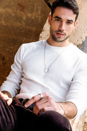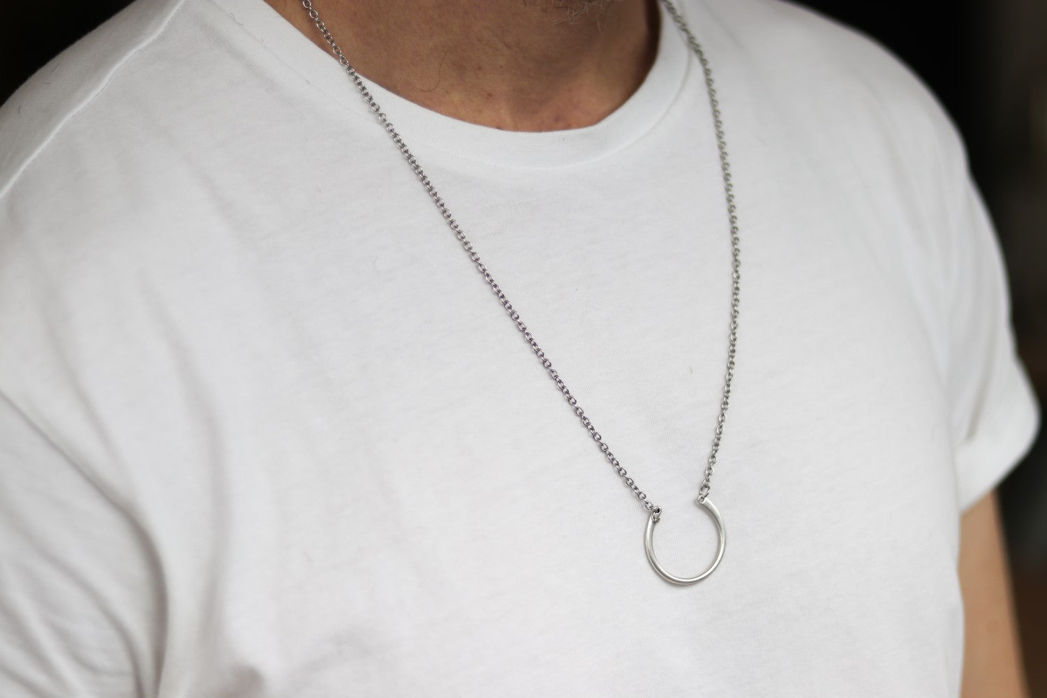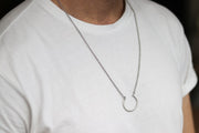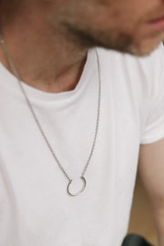 Halskette für Männer – Herrenhalskette mit einem versilberten offenen Kreisanhänger an einer Edelstahlkette und einem Karabinerverschluss.