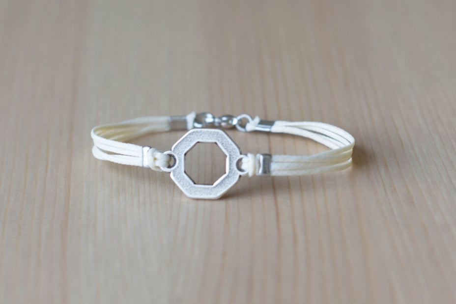 Sechseckiges Armband für Herren – Kordelarmband mit einem versilberten sechseckigen Anhänger. Die Kordeln sind schwarz und bestehen aus gewachster Baumwolle und der Anhänger ist versilbert. Sie können eine andere Kordelfarbe als die im letzten Bild gezeigten Farben anfordern. Hakenverschluss.