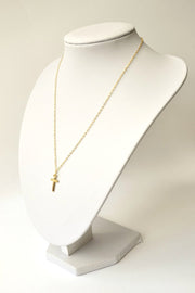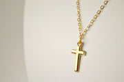 Kreuzhalskette – eine Halskette aus Edelstahl mit einem vergoldeten Kreuzanhänger. Die Kette ist 16 Zoll lang und verfügt über eine 1 1/2 Zoll lange Verlängerung. Hakenverschluss.