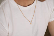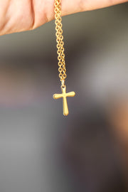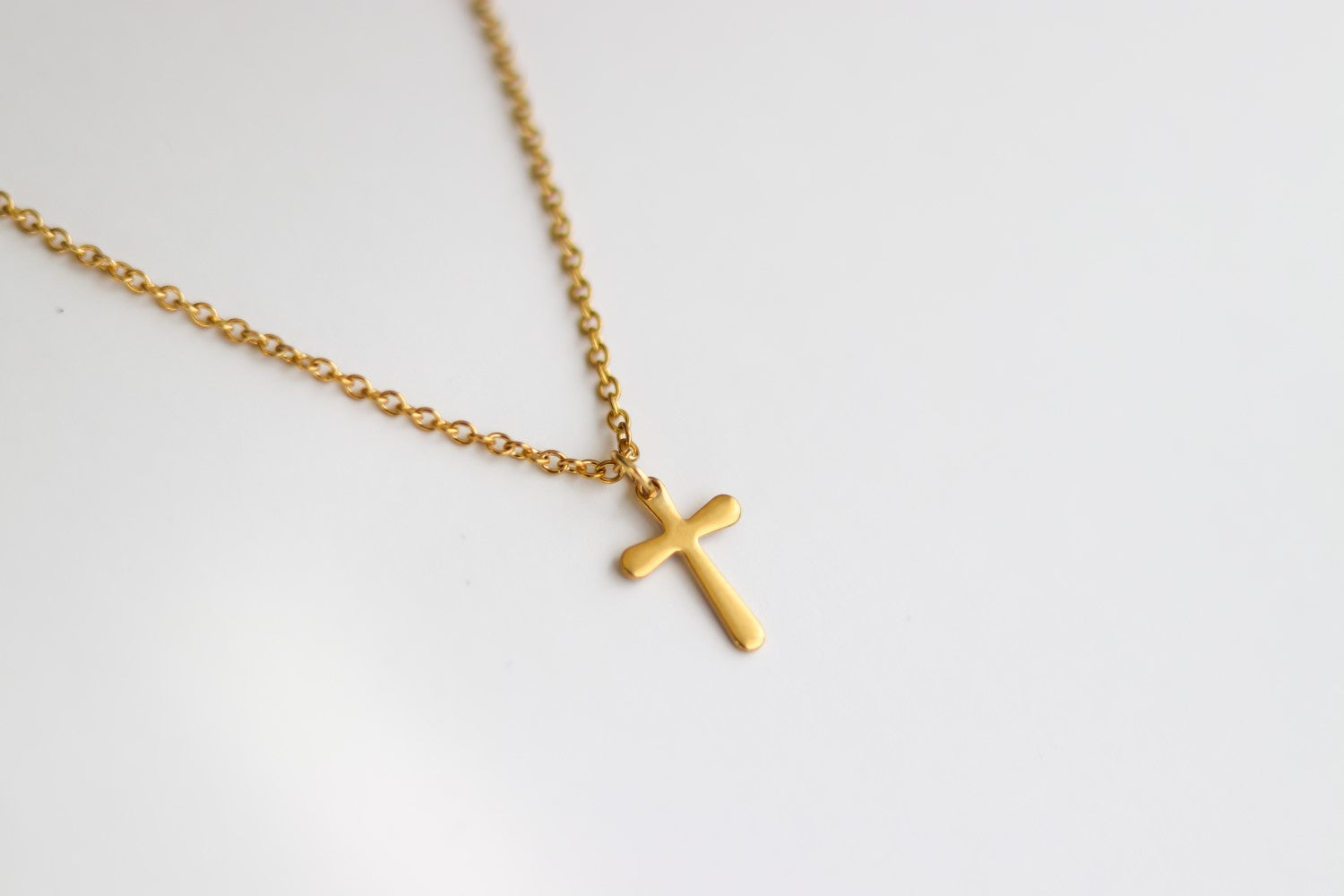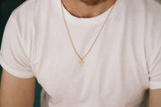 Kreuzhalskette für Männer – Herrenhalskette mit einem goldfarbenen Kreuzanhänger aus Edelstahl an einer goldfarbenen Edelstahlkette und einem Karabinerverschluss.