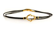 Fußkettchen mit Hamsa-Anhänger – gewickeltes Fußkettchen aus Kordel mit vergoldetem Hamsa-Anhänger. Die Kordel ist türkis und aus Baumwolle gefertigt. Der Hamsa-Anhänger ist 14 Karat vergoldet. Das Fußkettchen wird mit einer Verlängerung geliefert, sodass es verstellbar ist. Sie können eine Kordel in einer anderen Farbe wählen, als die auf dem letzten Bild gezeigten Farben. Verschluss mit Karabinerhaken.
