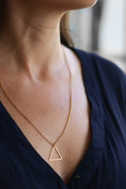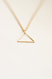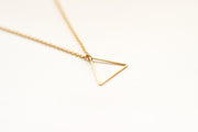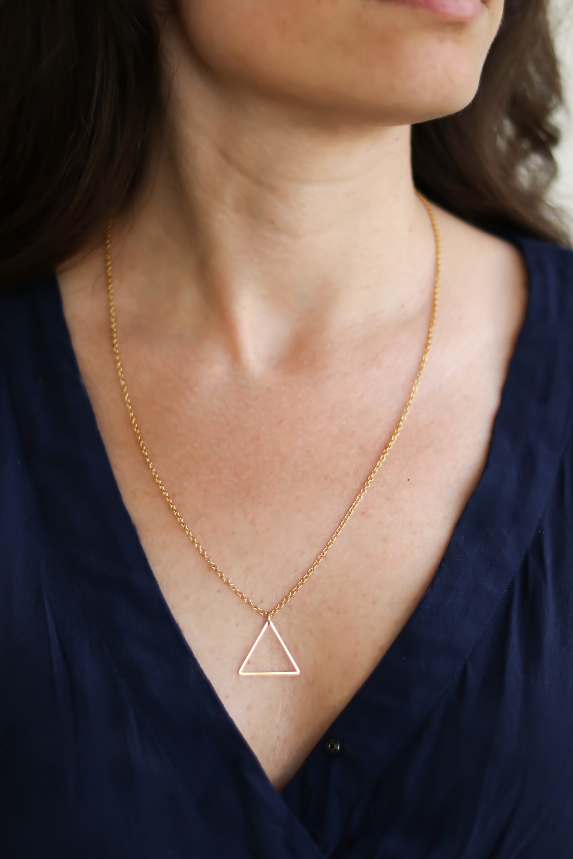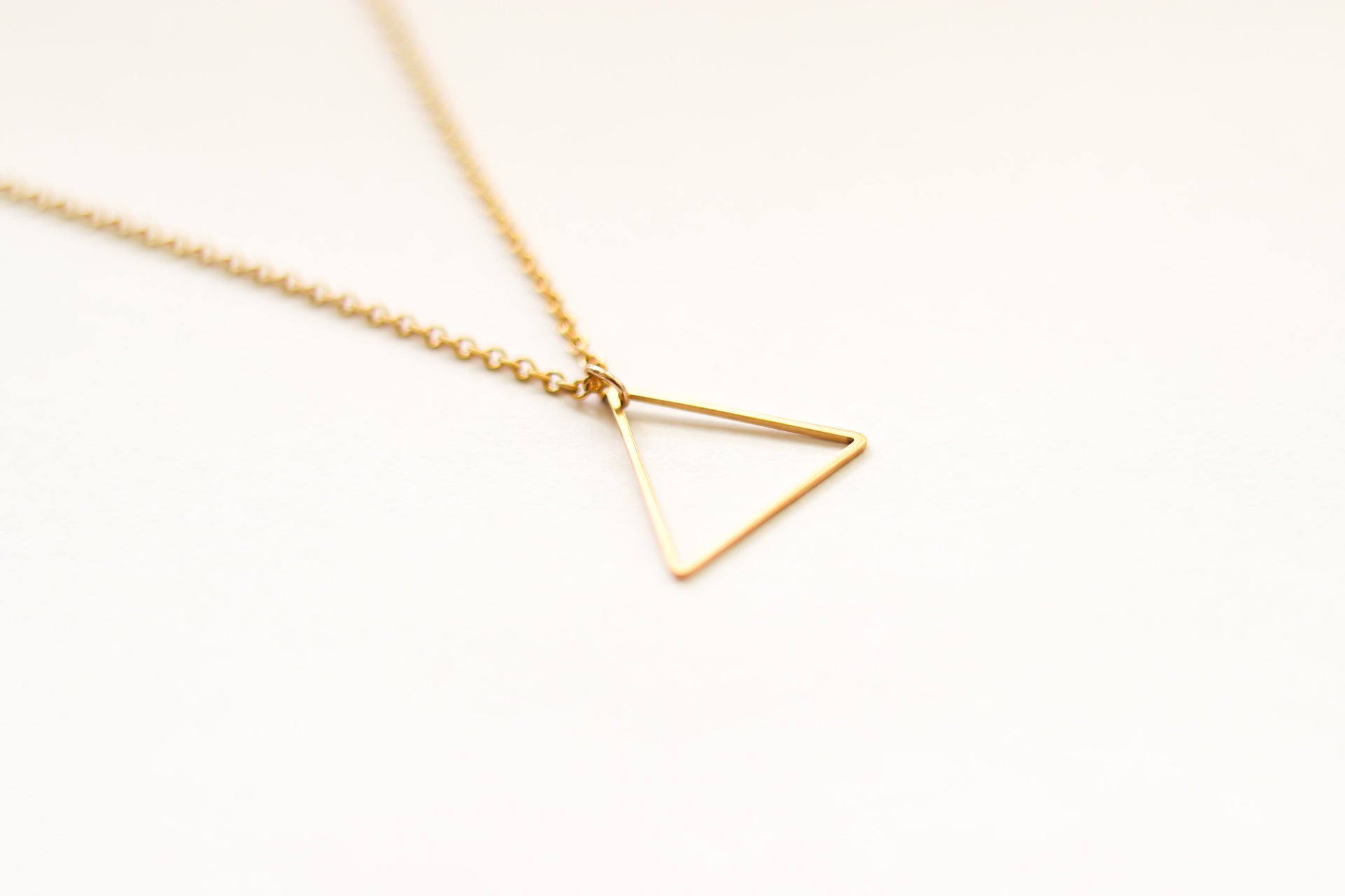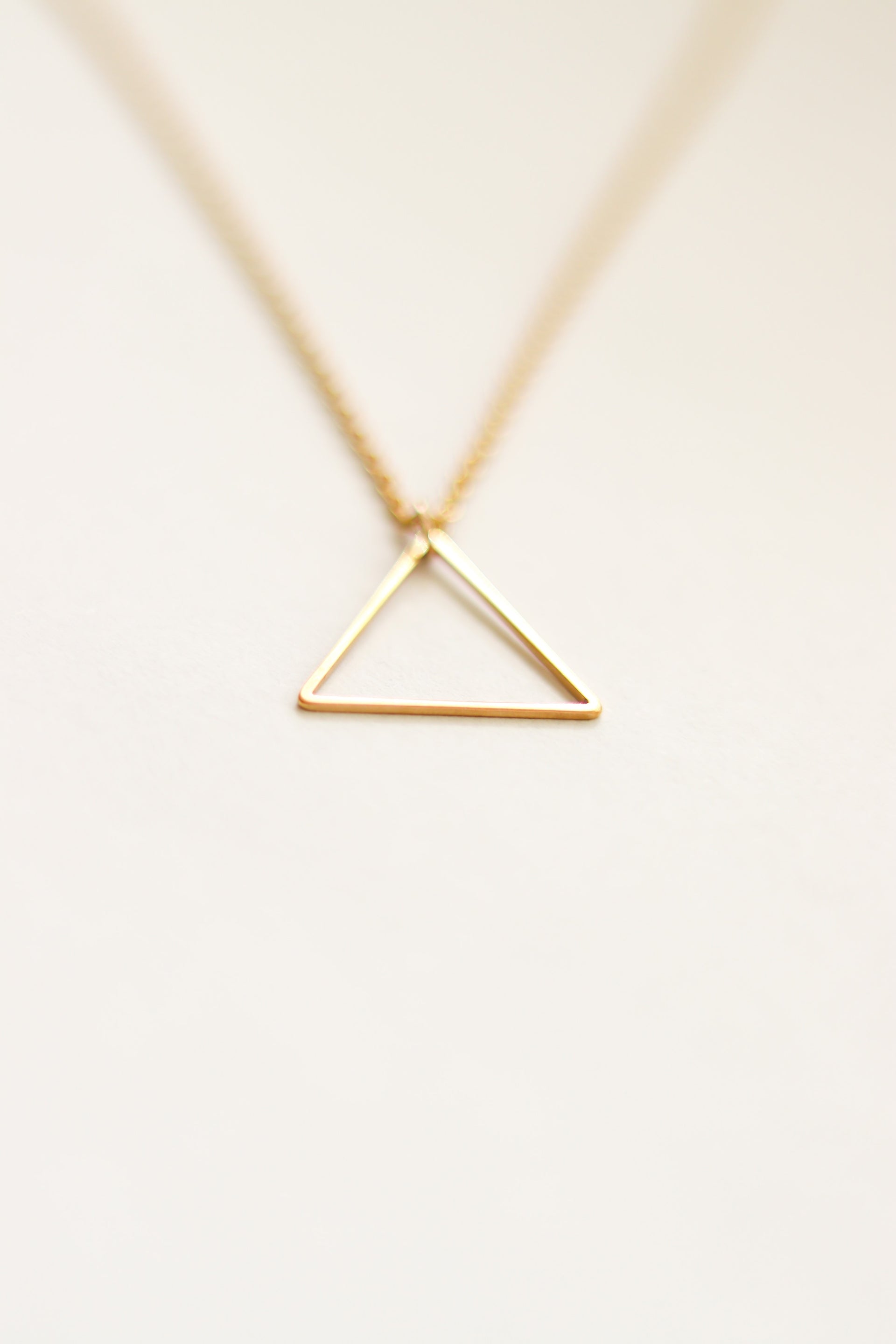 Dreieckige Halskette – minimalistische Halskette mit einer Edelstahlkette und einem baumelnden goldfarbenen Dreiecksanhänger.