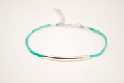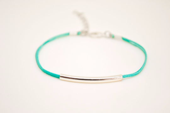 Armband mit silbernem Stab – Kordelarmband mit einem silberplattierten Röhrchenanhänger. Die Kordel ist grau und aus Baumwolle gefertigt, das Röhrchen ist silberplattiert. Das Armband wird mit einer Verlängerung geliefert, sodass es verstellbar ist. Verschluss mit Karabinerhaken. Sie können eine andere Kordelfarbe aus den auf dem letzten Bild gezeigten Farben auswählen.