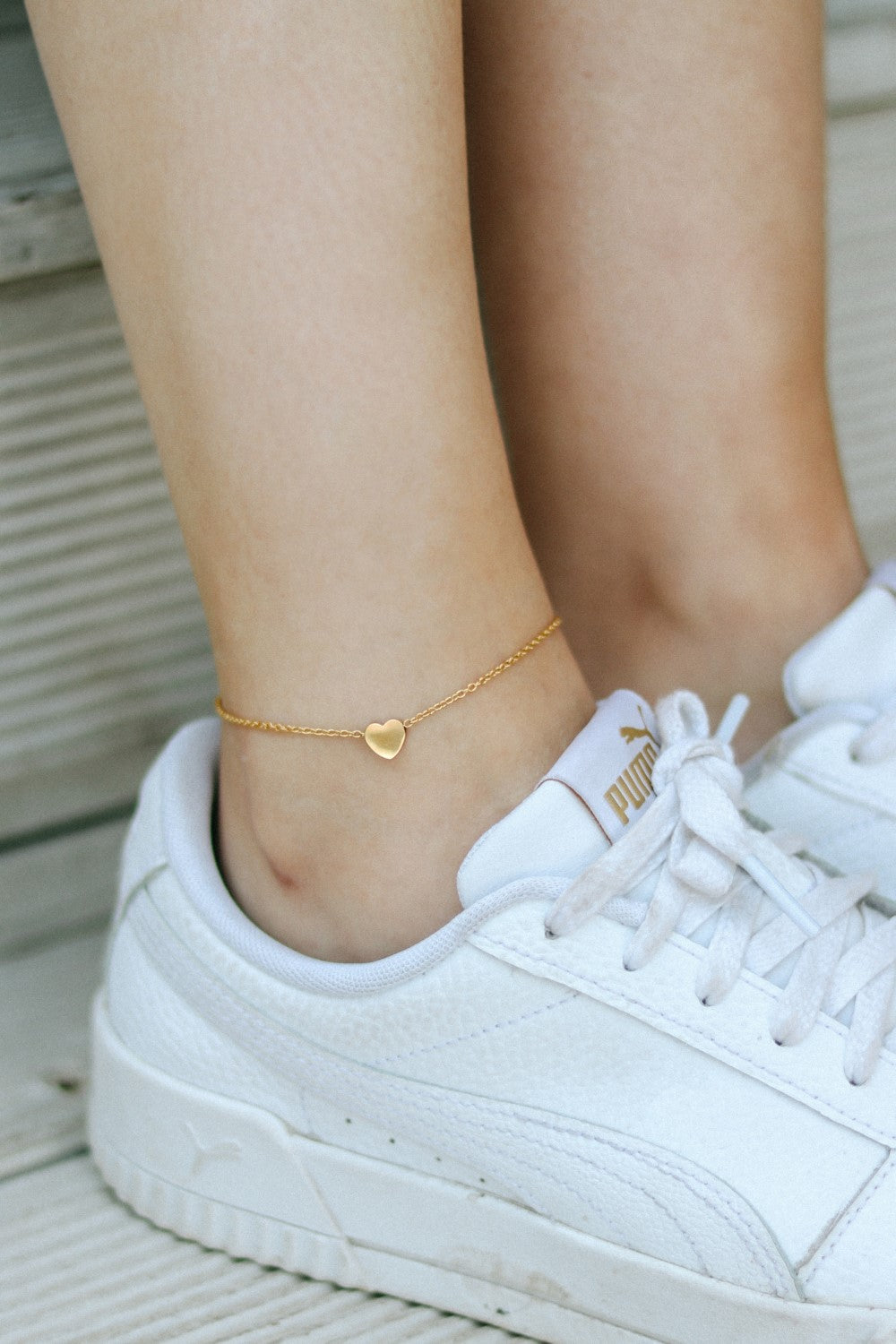 Ein minimalistisches Herz-Fußkettchen mit einem kleinen Herzperlenanhänger an einer goldfarbenen Edelstahlkette. Hakenverschluss.