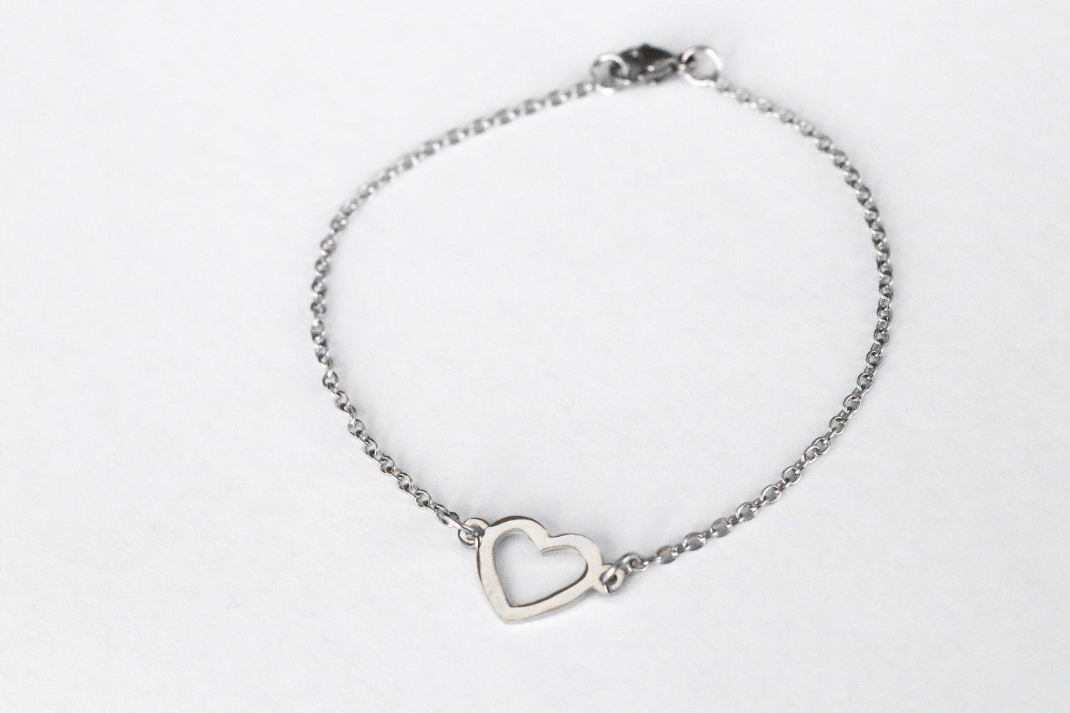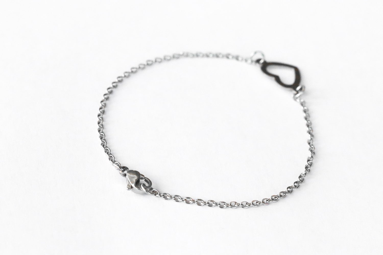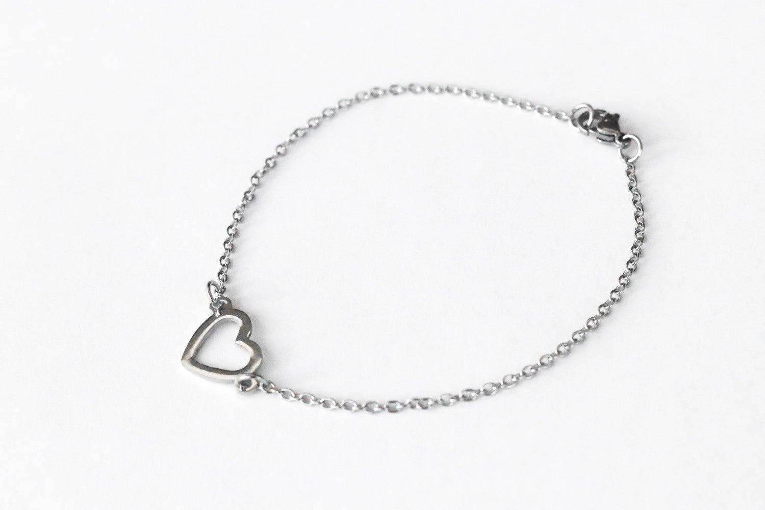 Fußkettchen mit herzförmigem Anhänger in Silberoptik an einer wasserfesten Edelstahlkette in Silberoptik. Karabinerverschluss.