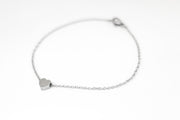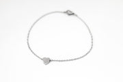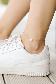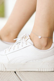 Ein minimalistisches Herz-Fußkettchen mit einem kleinen Herzperlenanhänger an einer wasserfesten Kette aus silberfarbenem Edelstahl. Hakenverschluss.