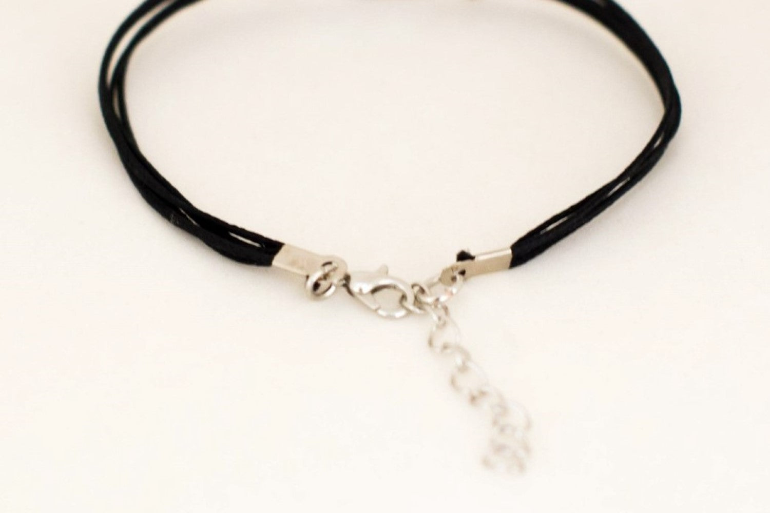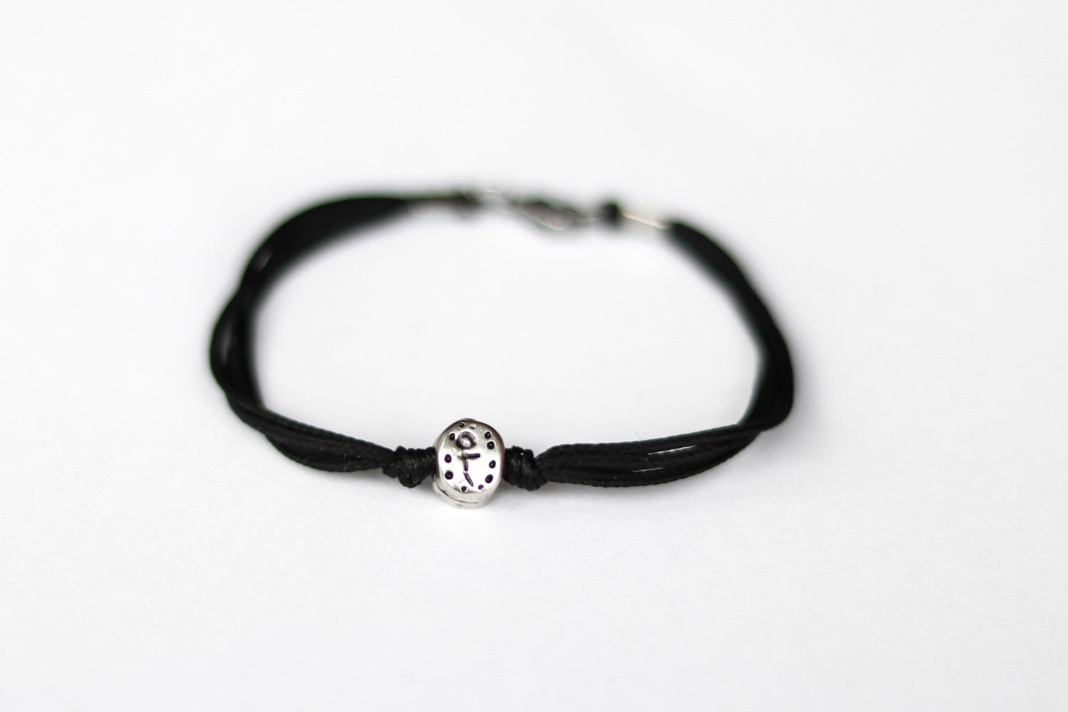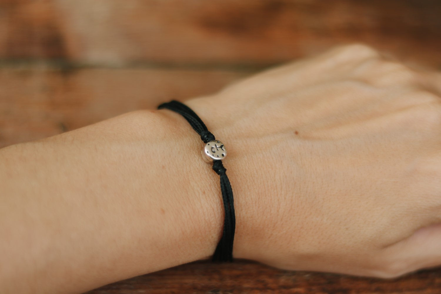 Zwei-Kinder-Armband – Kordelarmband mit zwei versilberten Perlenanhängern, in die eine Kinderillustration eingraviert ist. Die Farbe der Kordeln ist schwarz und sie bestehen aus gewachster Baumwolle, der Anhänger ist versilbert. Das Armband wird mit einer Verlängerung geliefert, sodass es verstellbar ist. Hakenverschluss. Sie können eine andere Kordelfarbe als die im letzten Bild gezeigten Farben anfordern.