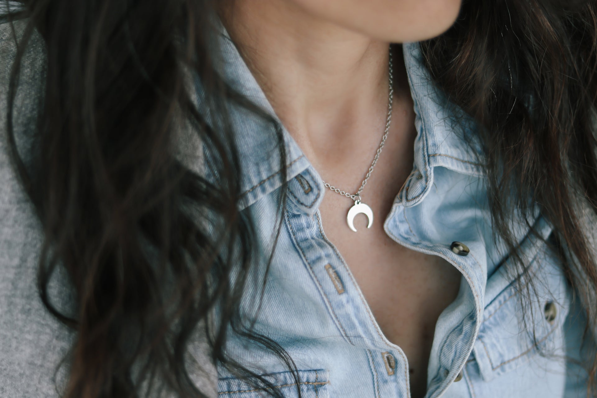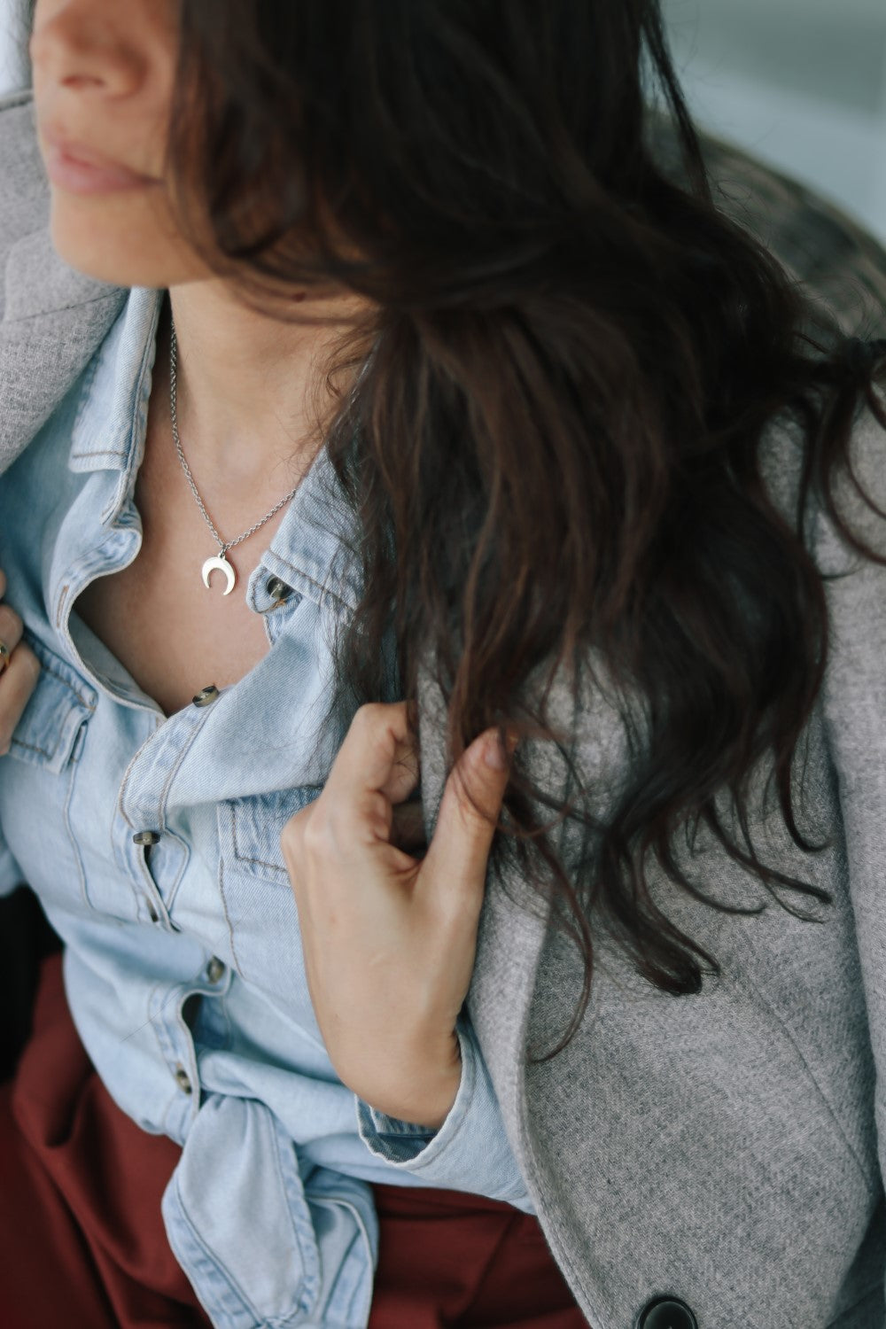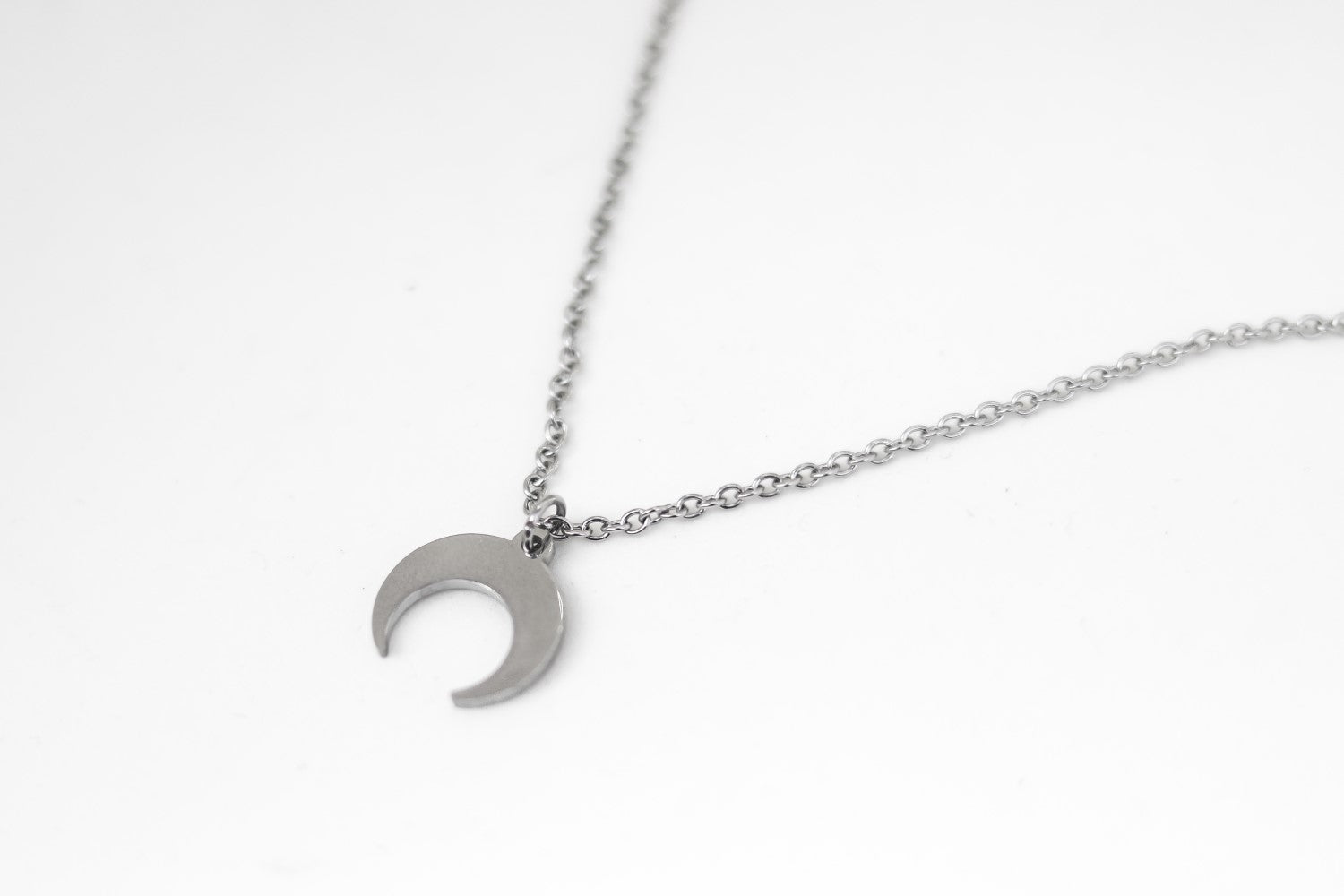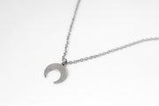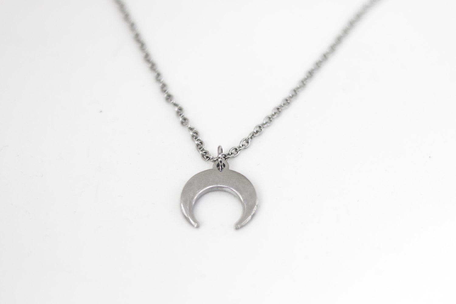 Halbmond-Halskette – minimalistische Halskette mit einer Edelstahlkette und einem Halbmond-Anhänger aus Edelstahl.