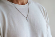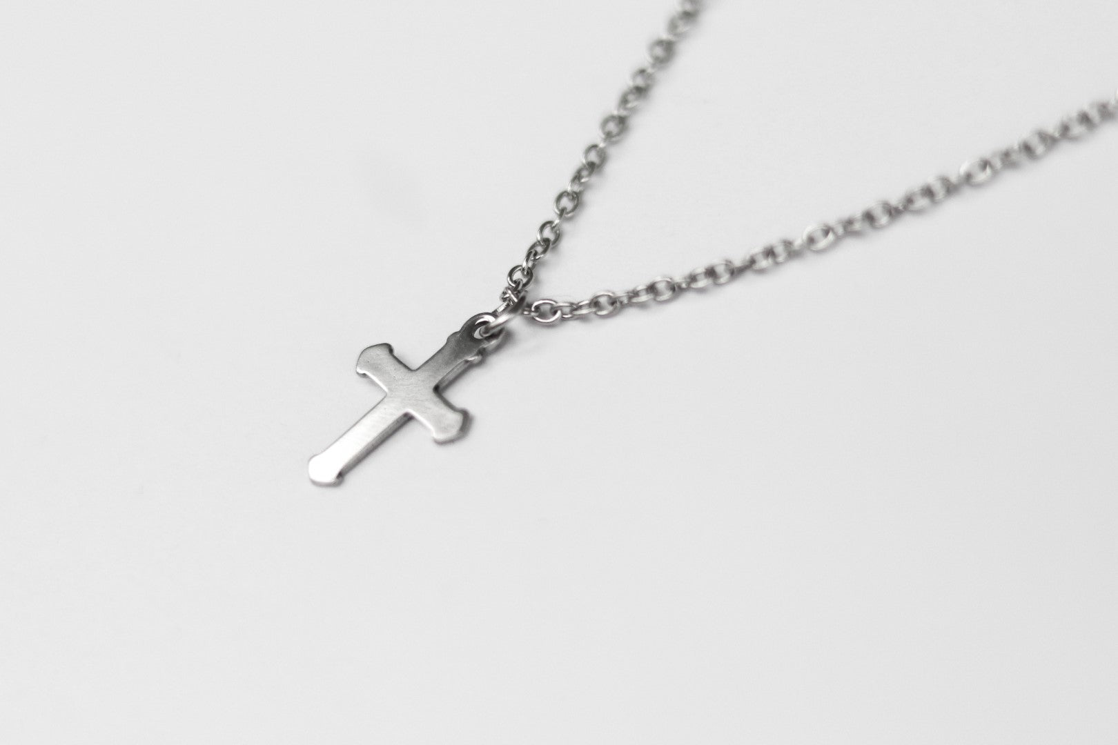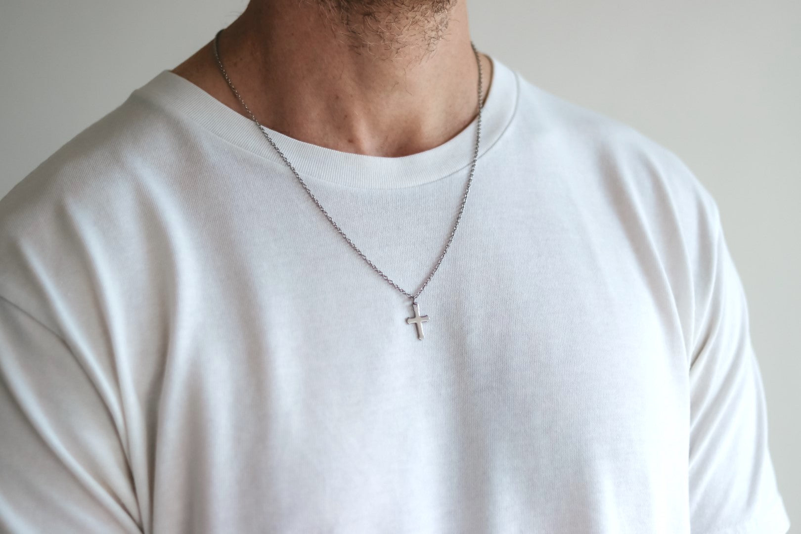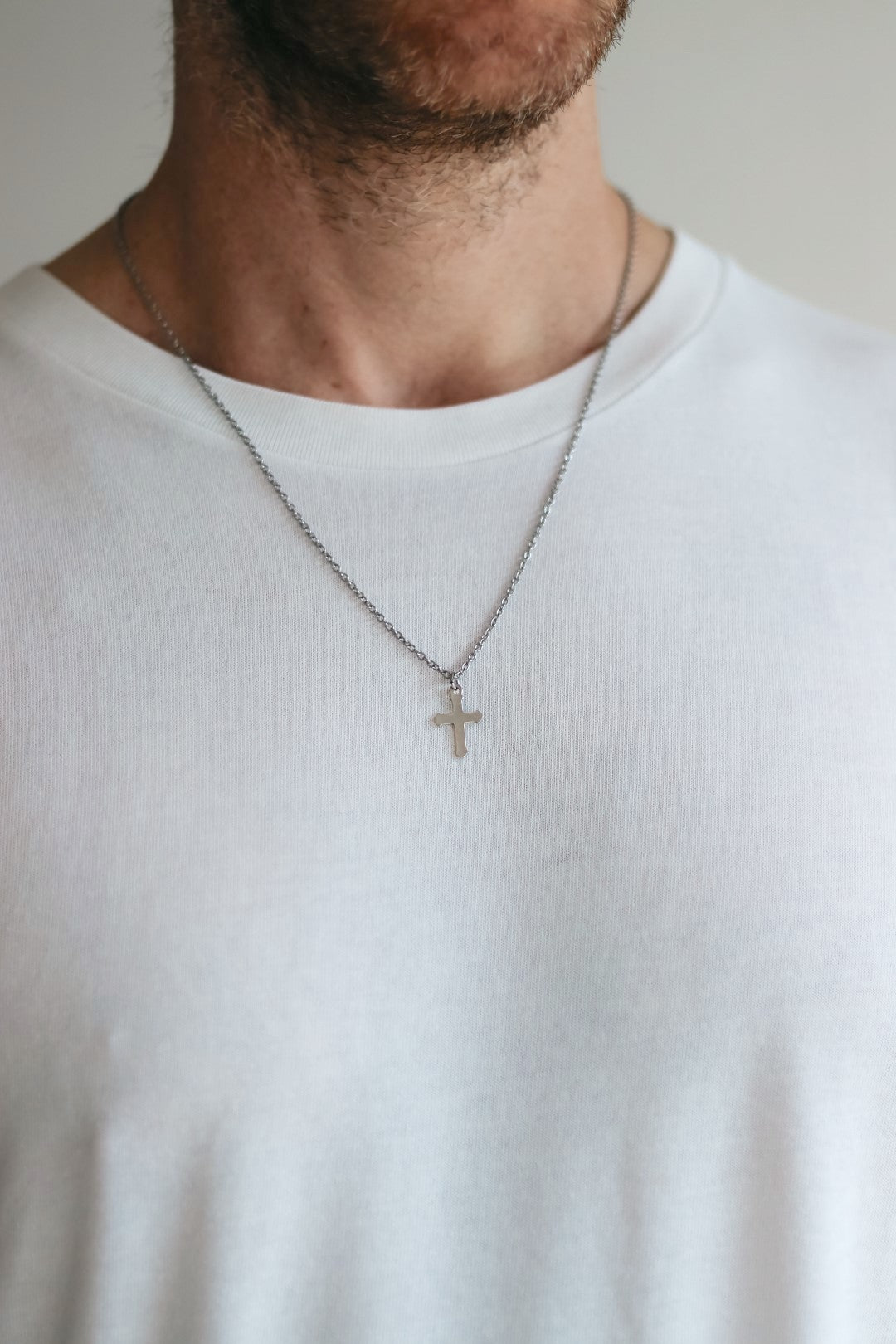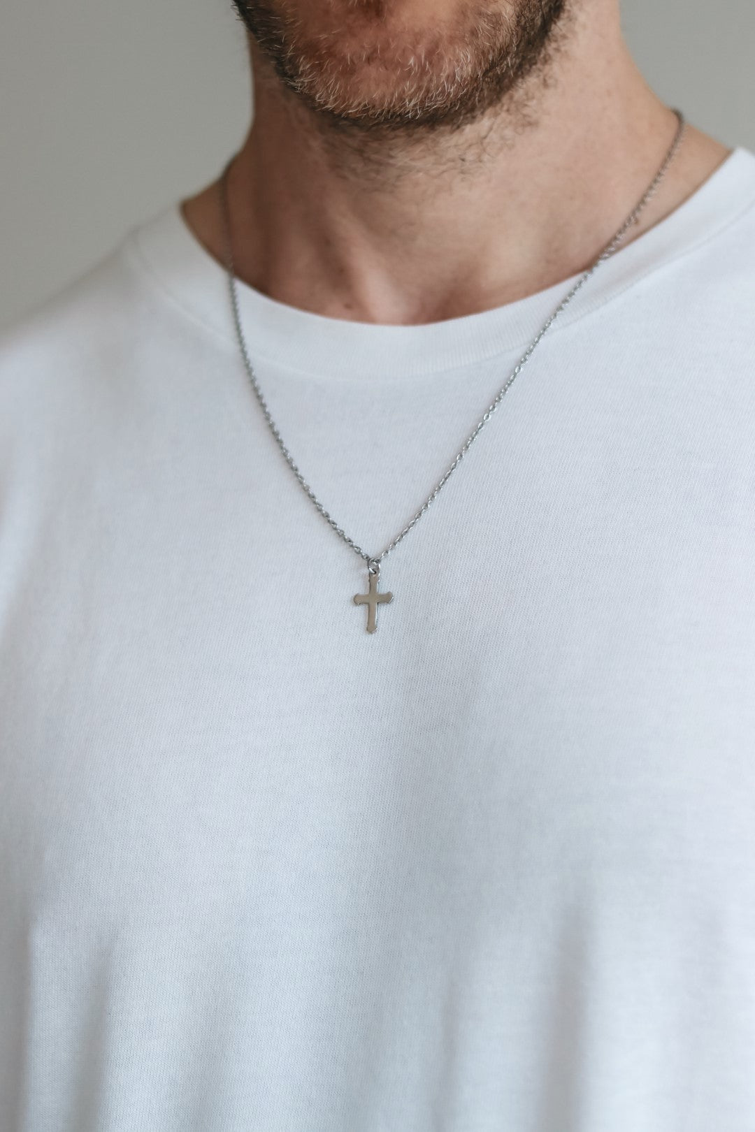 Kreuzhalskette für Herren – Herrenhalskette mit einem Kreuzanhänger aus Edelstahl an einer Edelstahlkette und einem Karabinerverschluss.