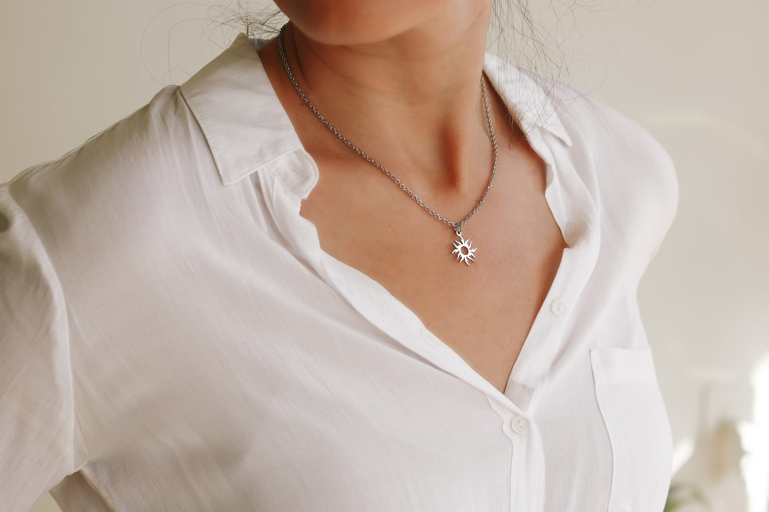 Sonnenhalskette – minimalistische Halskette mit einer Edelstahlkette und einem silberfarbenen Edelstahl-Sonnenanhänger mit Umriss.