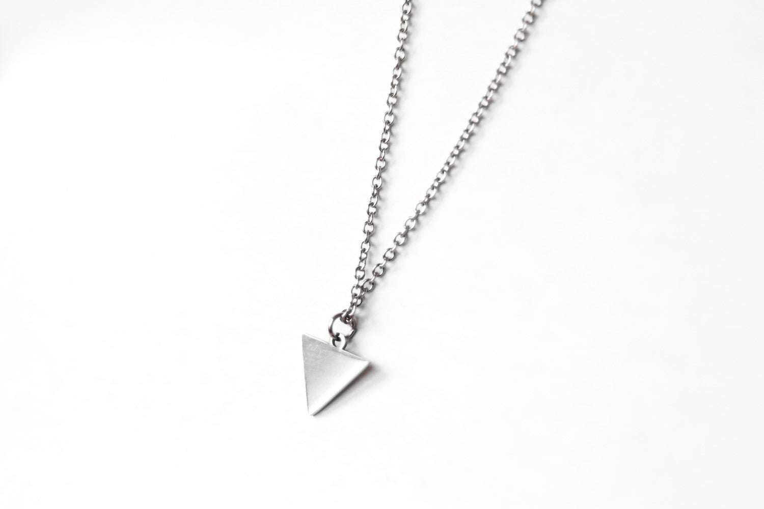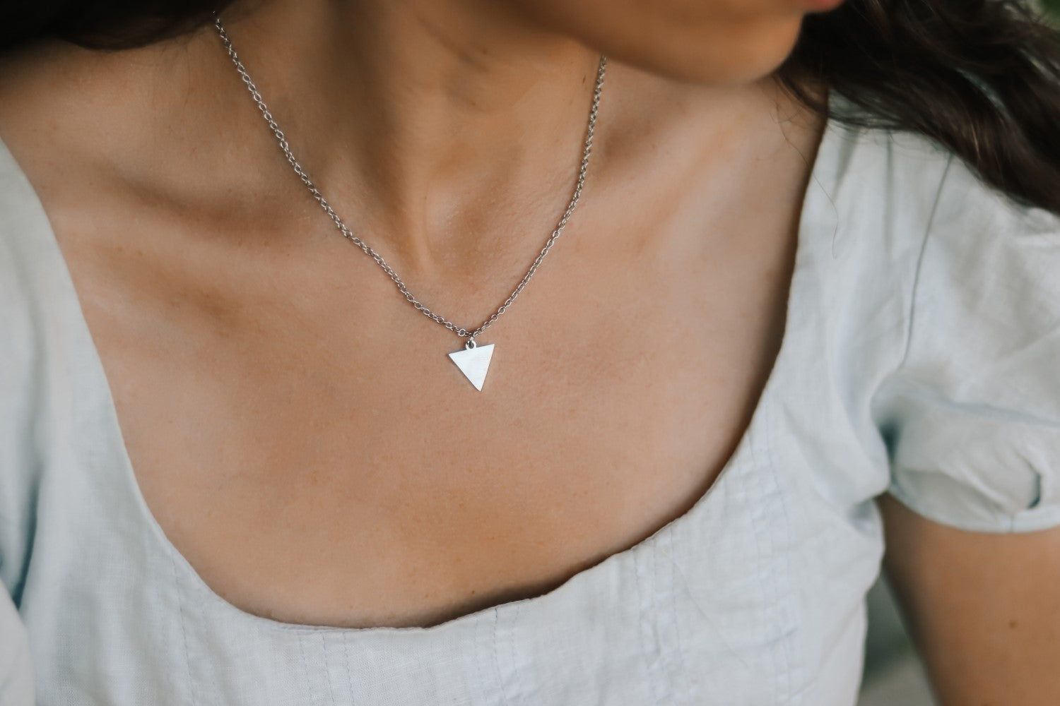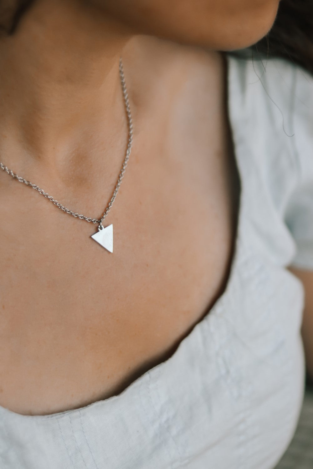 Dreieckskette – minimalistische Kette mit einer silberfarbenen Edelstahlkette und einem silberfarbenen Edelstahl-Dreiecksanhänger. Wasserfeste Kette.
