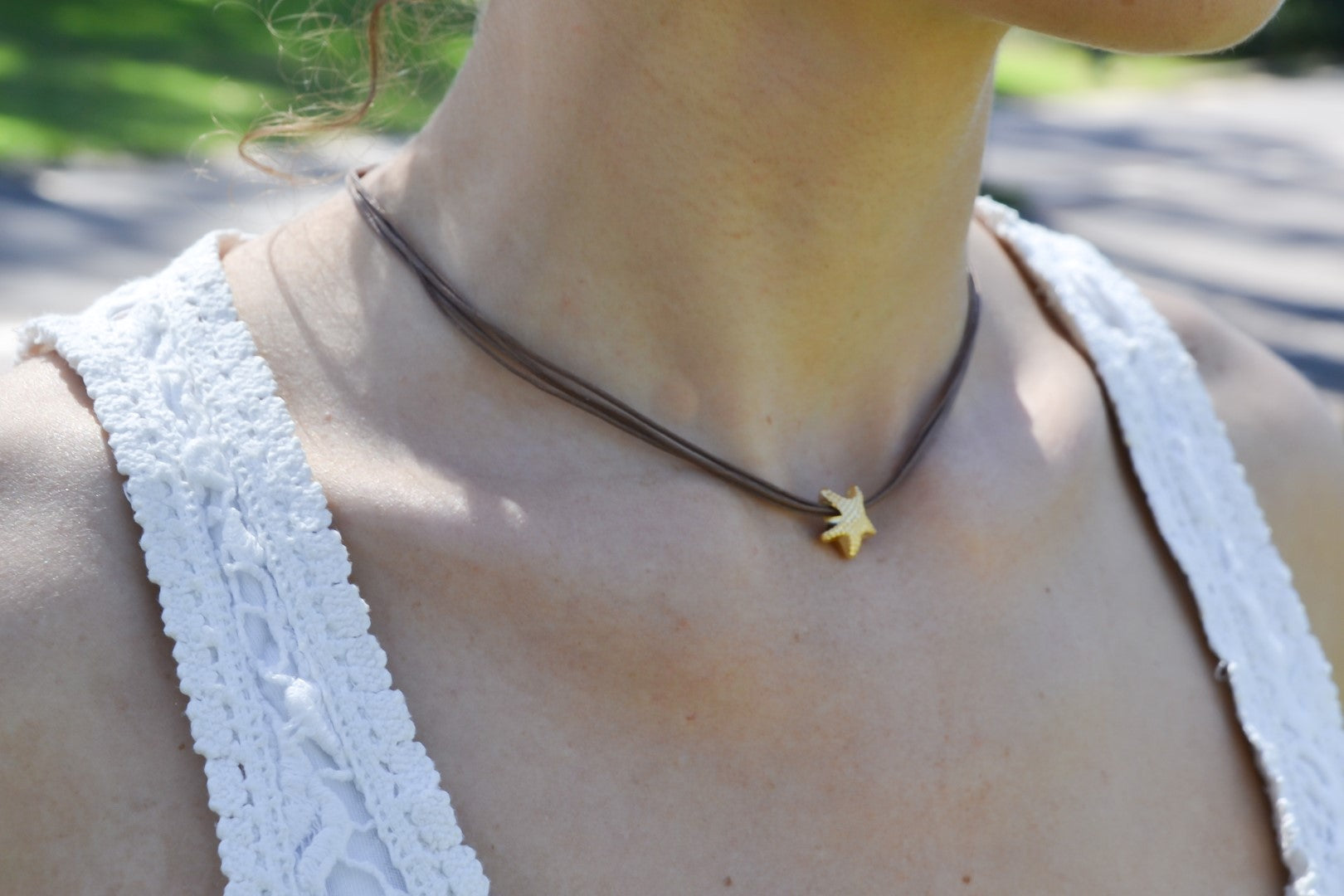 Goldene Seestern-Halskette für Frauen, braune Kordel, Geschenk für sie, Ozeanschmuck