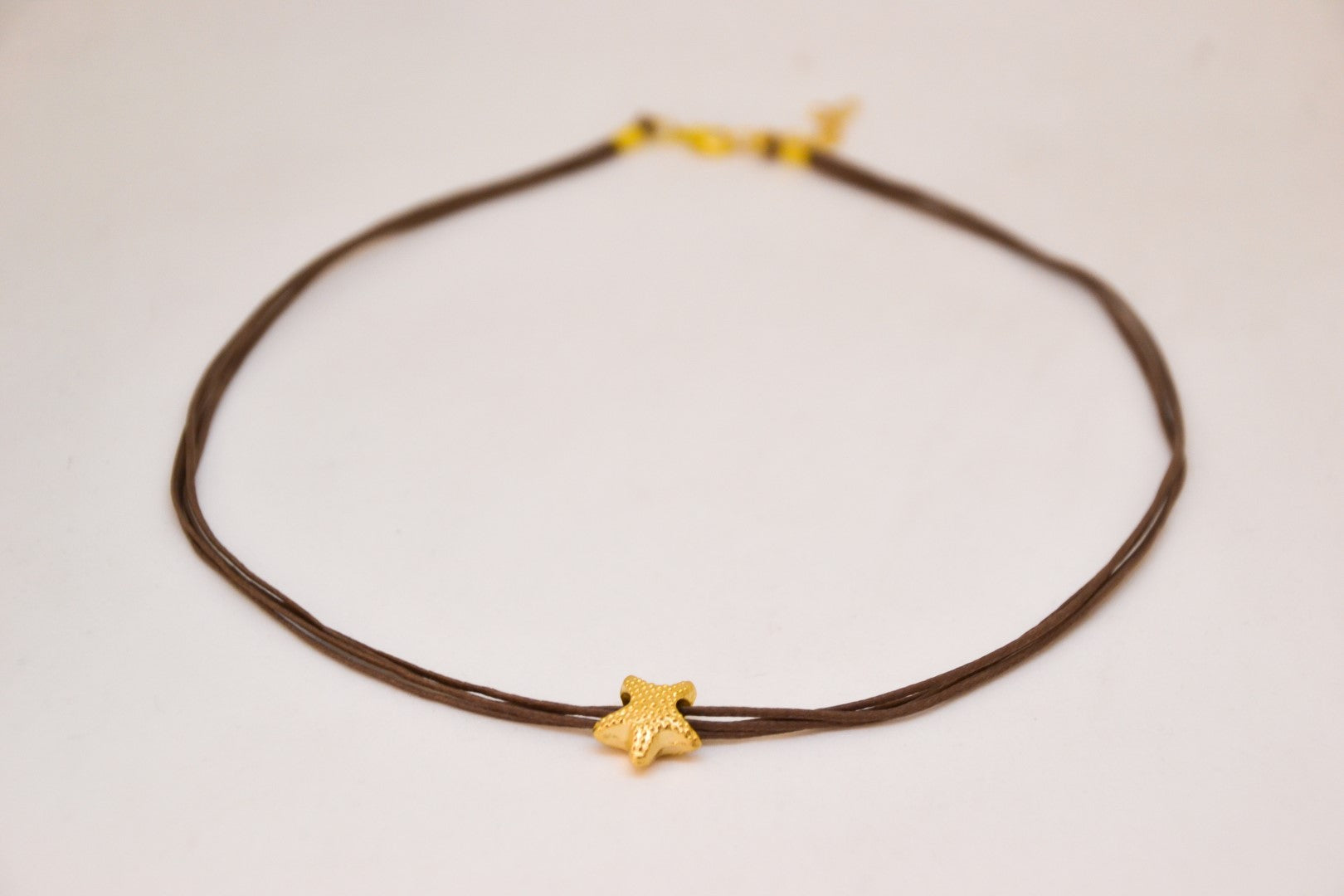 Seestern-Halskette – Kordelkette mit einem vergoldeten Seestern-Anhänger. Die Kordel ist dunkelbraun und aus Baumwolle gefertigt, der Anhänger ist 14 Karat vergoldet. Die Kette wird mit einer Verlängerung geliefert, sodass sie verstellbar ist. Verschluss mit Karabinerhaken. Sie können eine andere Kordelfarbe aus den auf dem letzten Bild gezeigten Farben auswählen.