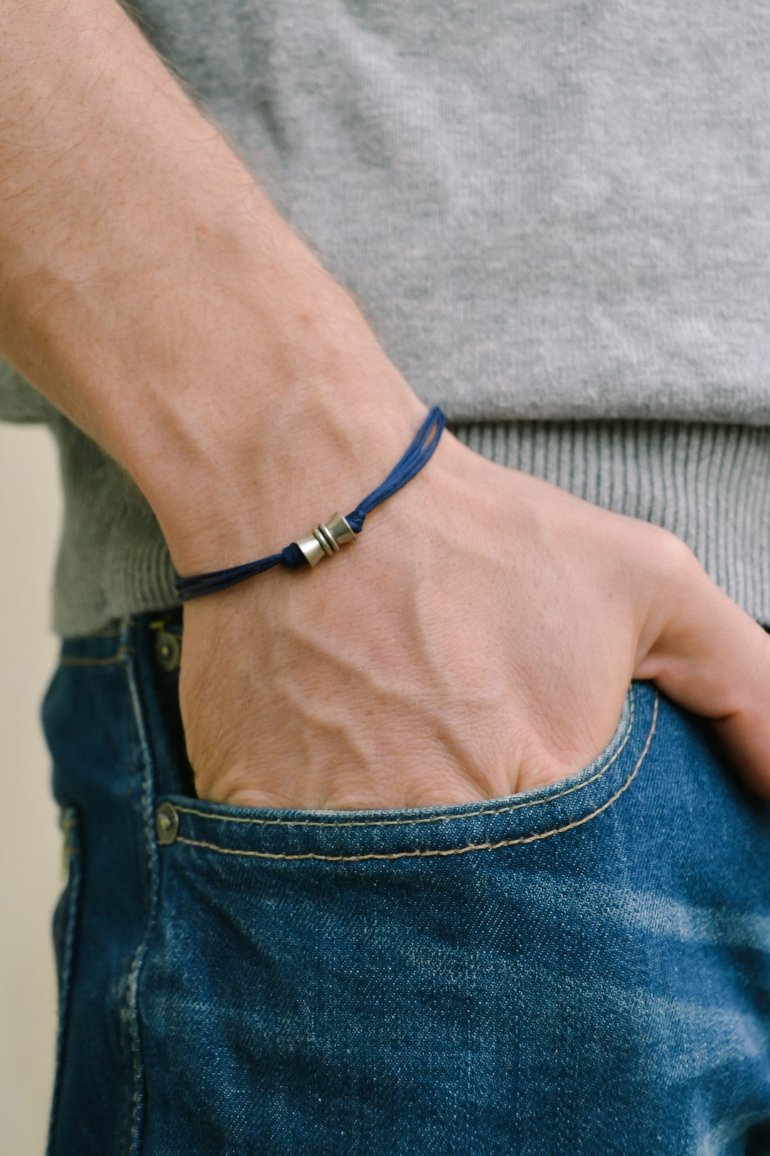 Bracelet for men with silver bead charm and black string, gift for him, gift wrapped
