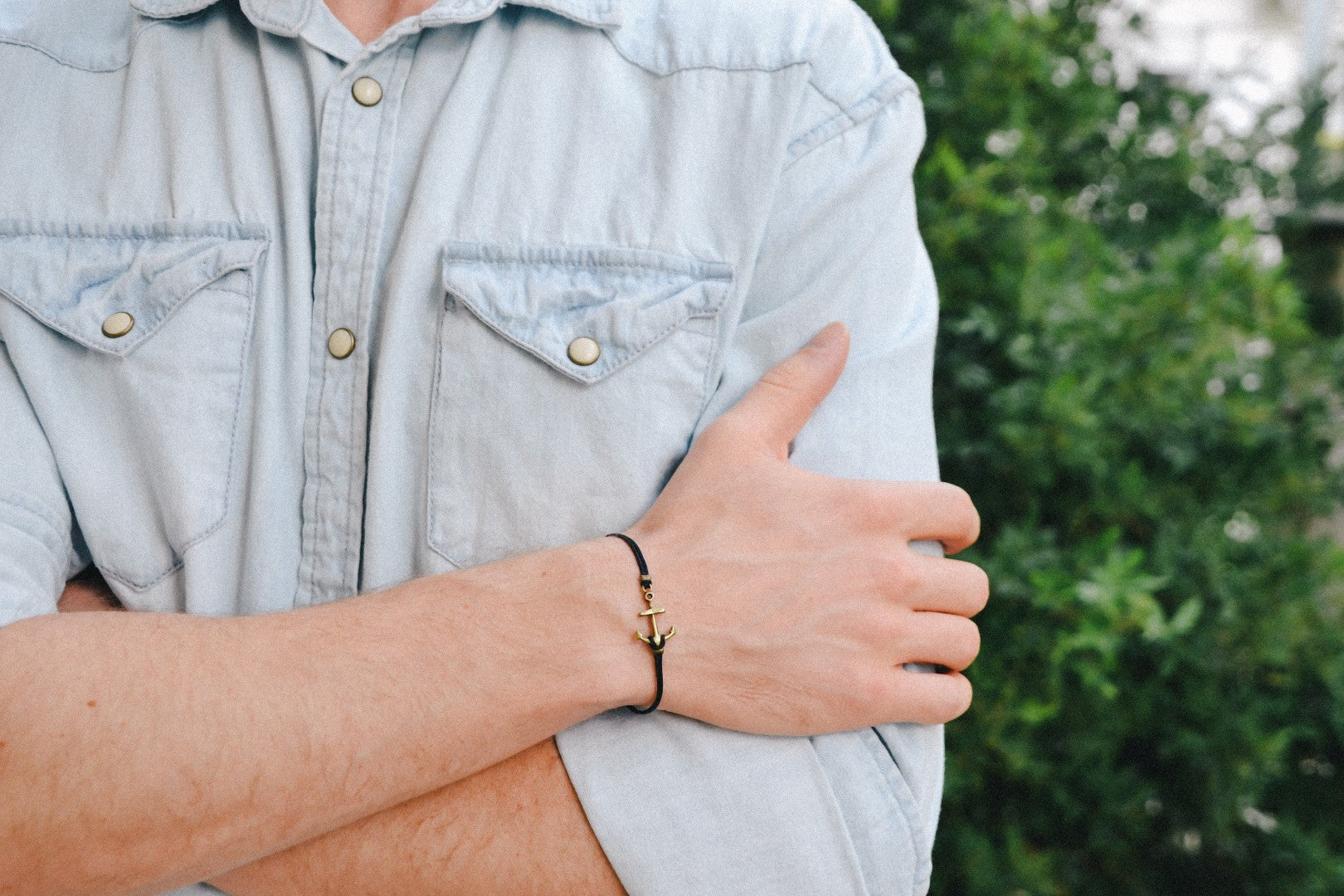 Bronze anchor bracelet for men, black cord, custom color and size, gift for him