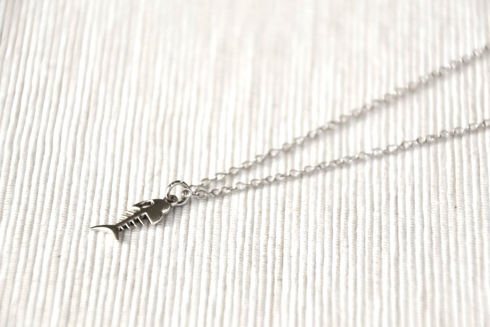 Fish bones necklace for men. Men's necklace with a small silver-tone fish bone pendant on a silver-tone chain and a clasp closure.