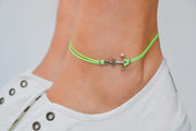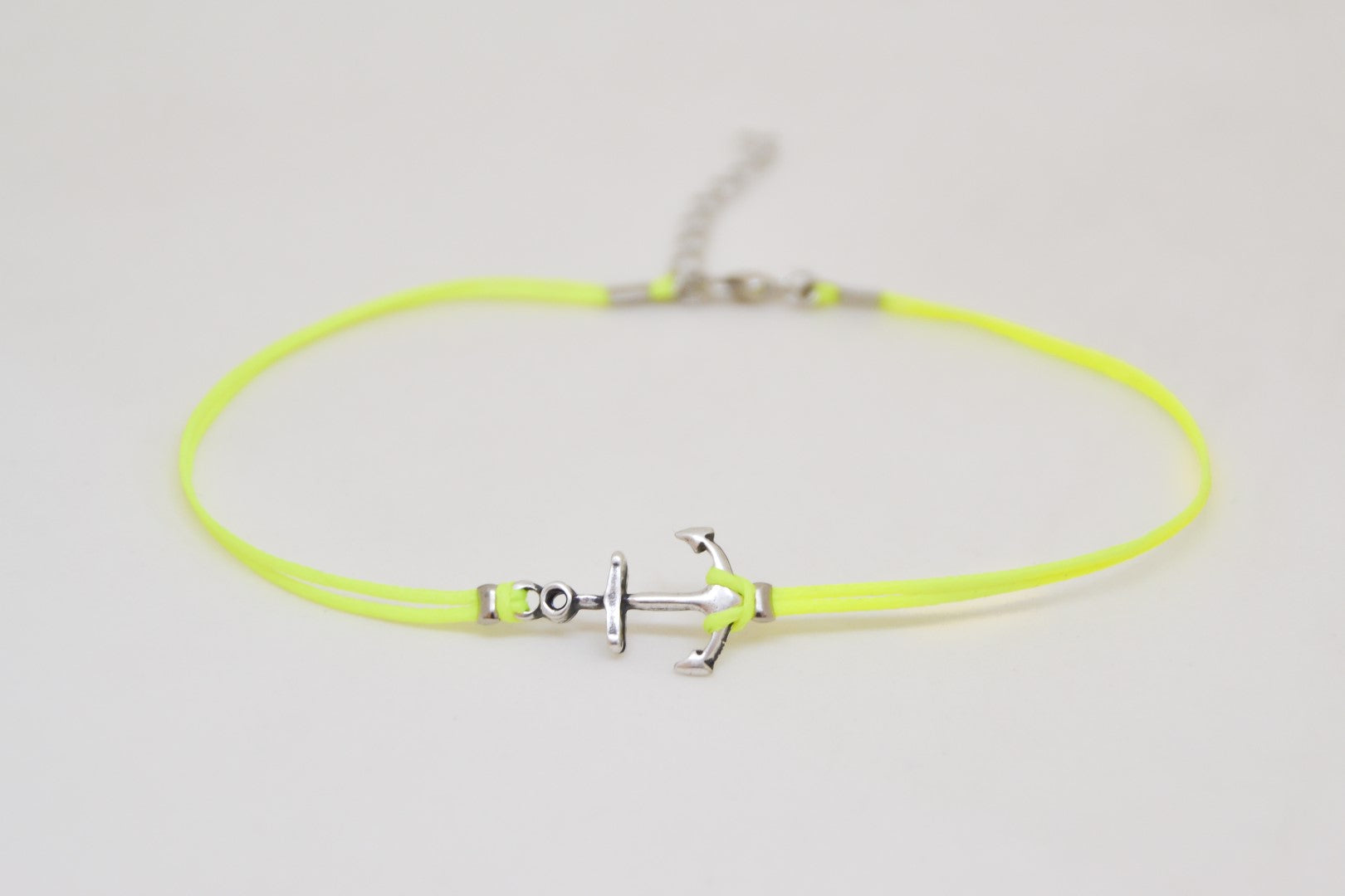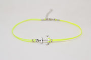 Anchor anklet - cord anklet with a silver plated anchor charm. The color of the cord is neon yellow and it is made of cotton. The anchor charm is silver plated. The anklet comes with an extension so it is adjustable. Clasp closure. You can choose a thread in a different color from the colors shown in the last picture.